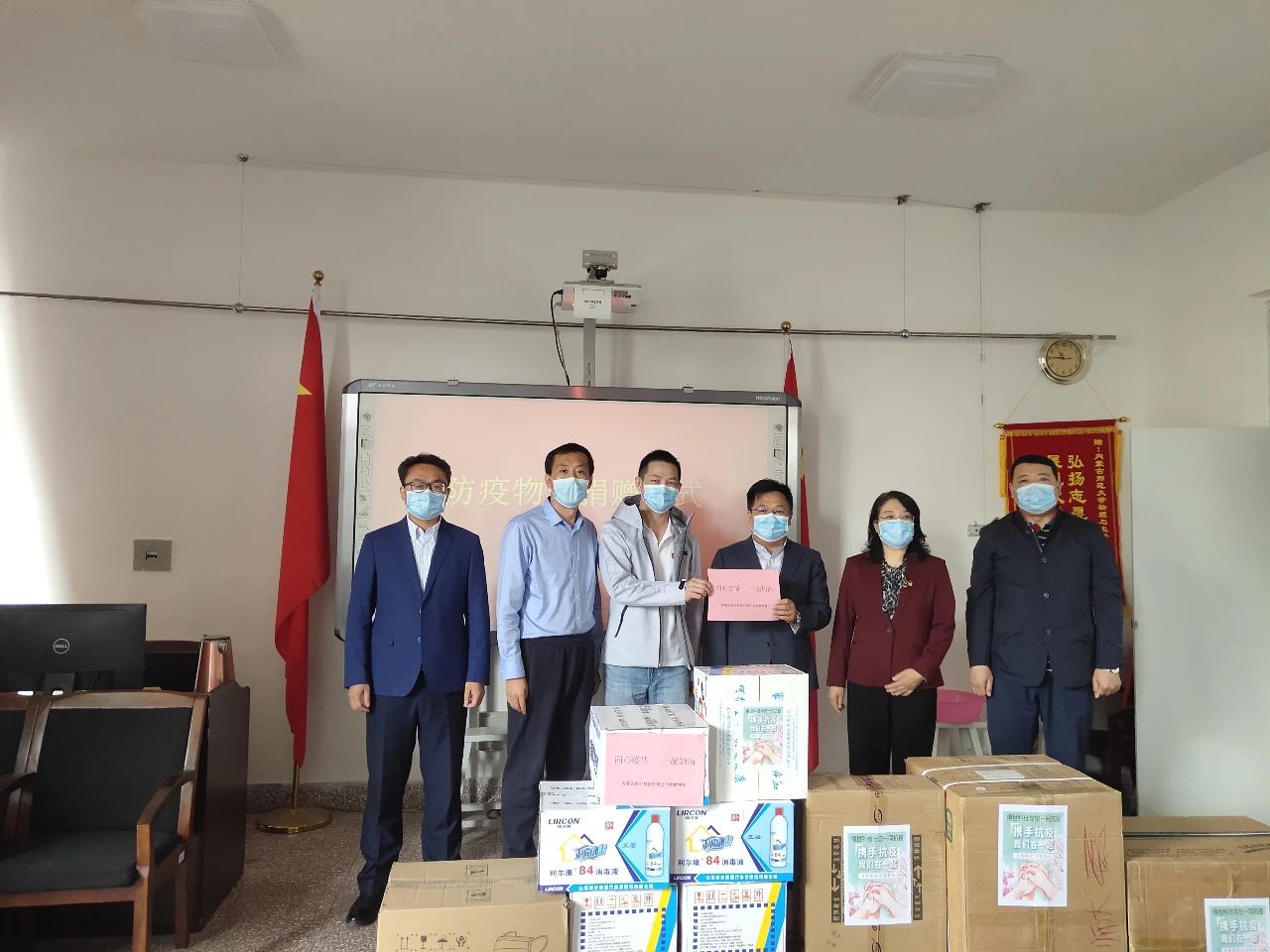 同舟共济抗击疫情,爱心捐赠暖人心。5月7日上午,内蒙古得世科技有限公司、内蒙古凯硕商贸有限公司和武汉集思仪器设备有限公司向我院捐赠一批防疫物资。捐赠仪式在物理楼会议室举行,我院党委书记刘美玲、副院长曹永军、党委副书记张伟、副院长那日苏以及办公室主任张天臣代表学院接受捐赠物资。