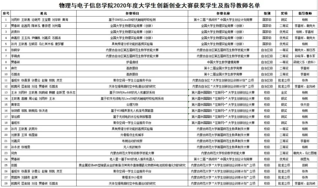 第三项,学院领导为获得2020年度创新创业先进个人以及创新创业优秀指导教师颁奖。我院2017级物理蒙班何良、2017级物理汉班张晓宇、2017级工程班潘旭东、2018级物理汉班钱莫闲、2018级材料班田璐、2019级物理汉1班樊璐玮等23名同学获得学院2020年度创新创业先进个人奖。我院教师曹永军、张伟、那日苏、赵凤岐、田晓、孙咏萍、乌仁图雅、朝克夫、张天臣、杨帆、李喜彬等获2020年度创新创业优秀指导教师奖。