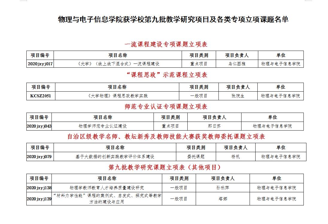 据悉,根据《关于开展第九批教学研究课题立项的通知》(内师教发〔2020〕 66 号)的要求,在学院审核、限额报送的基础上,全校共批准245项课题立项,其中,一流专业建设专项课题9项,一流课程建设专项课题31项,“课程思政”示范课程72项,师范专业认证专项课题8项,劳动教育专项课题12项,美育体育教育专项课题7项,基础教育专项课题8项,教学名师、教坛新秀及教师技能大赛获奖教师委托课题11项,第九批教学研究课题立项表(其他项目)87项。