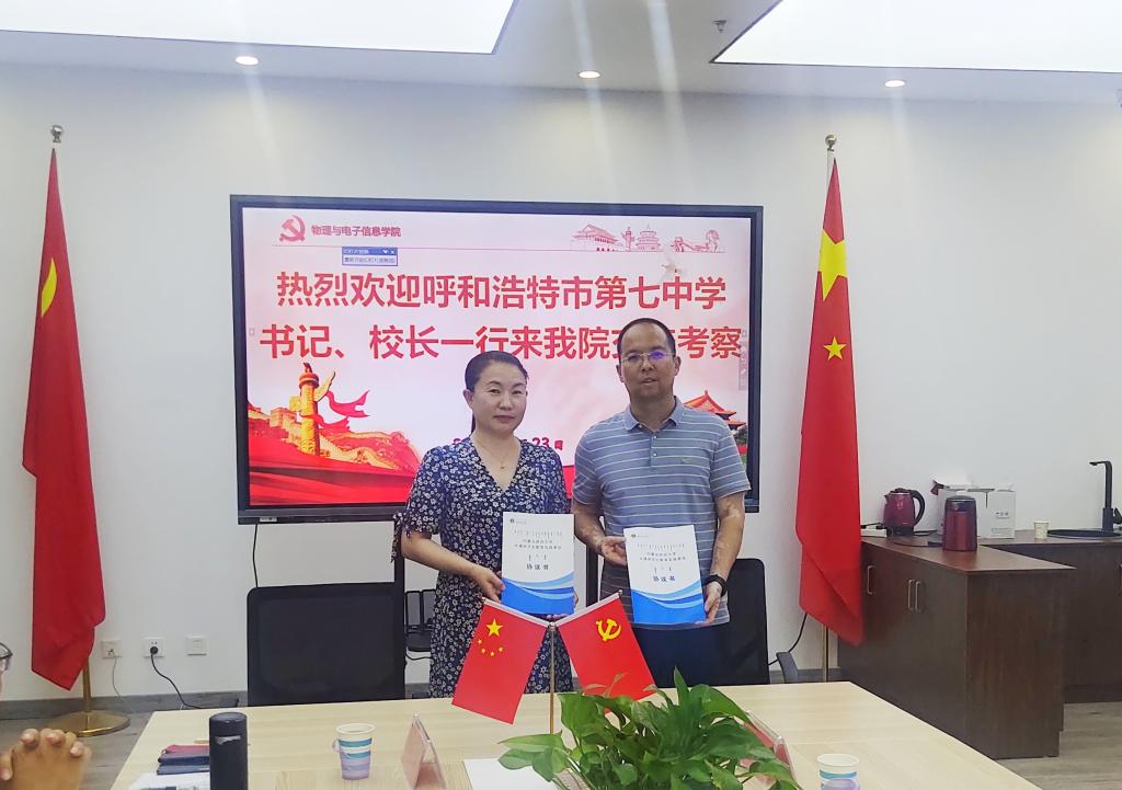 6月23日下午,呼和浩特市第七中学吴海鹰校长一行来我院交流考察。双方在yl6776永利集团理工楼A701会议室举行座谈会。会议由我院那日苏副院长主持。曹永军副院长和吴海鹰校长分别介绍了各自单位的基本状况;物理系副主任孙咏萍老师就学院近年来汉生班教育实习情况做了汇报与说明;教务处实践科负责人毕力根格日勒老师参会指导工作,并与七中校长签署了“共建师范生教育实践实习基地协议”。