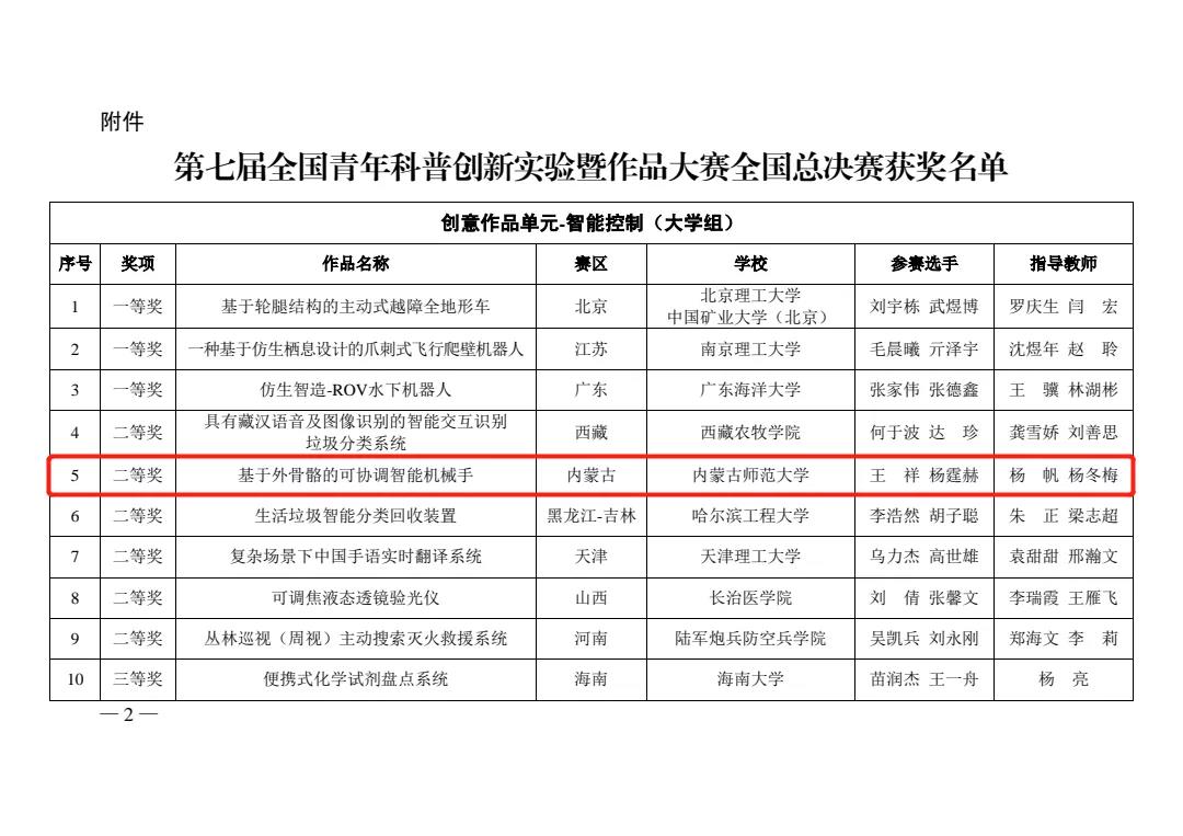 8月17日,中国科协办公厅公布第七届全国青年科普创新实验暨作品大赛全国总决赛获奖名单,最终确定第七届全国青年科普创新实验暨作品大赛全国总决赛一等奖15个、二等奖31个、三等奖44个、优秀奖59个。其中我院王祥、杨霆赫同学参赛的“基于外骨骼的可协调智能机械手”项目荣获二等奖,项目由杨帆、杨冬梅老师指导。