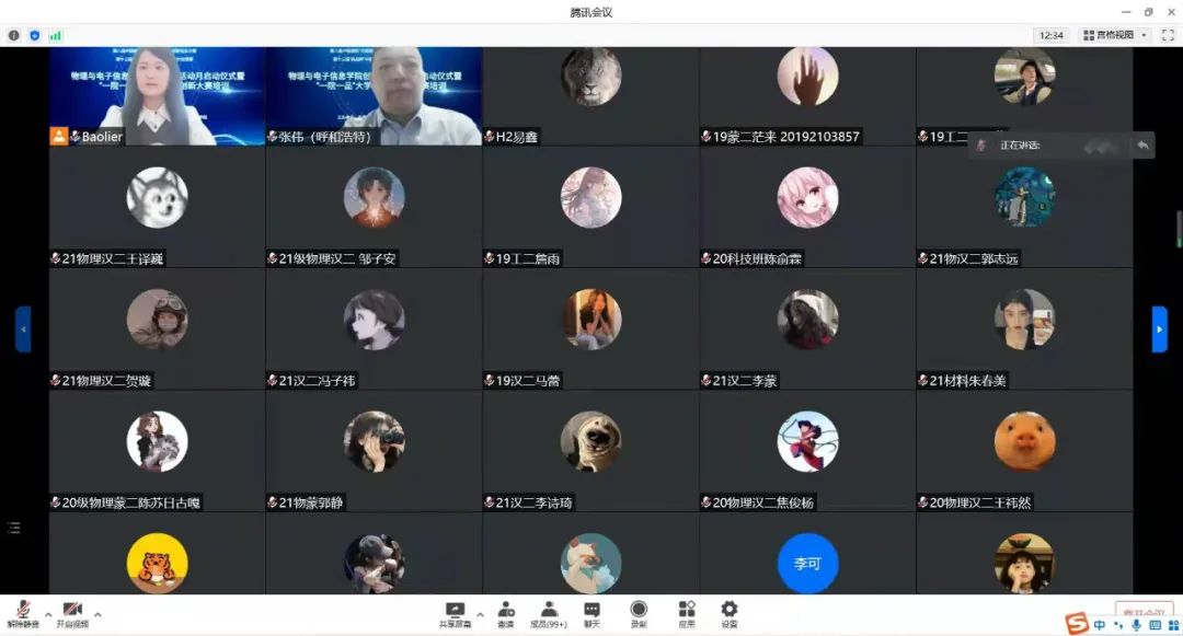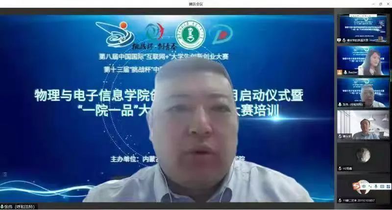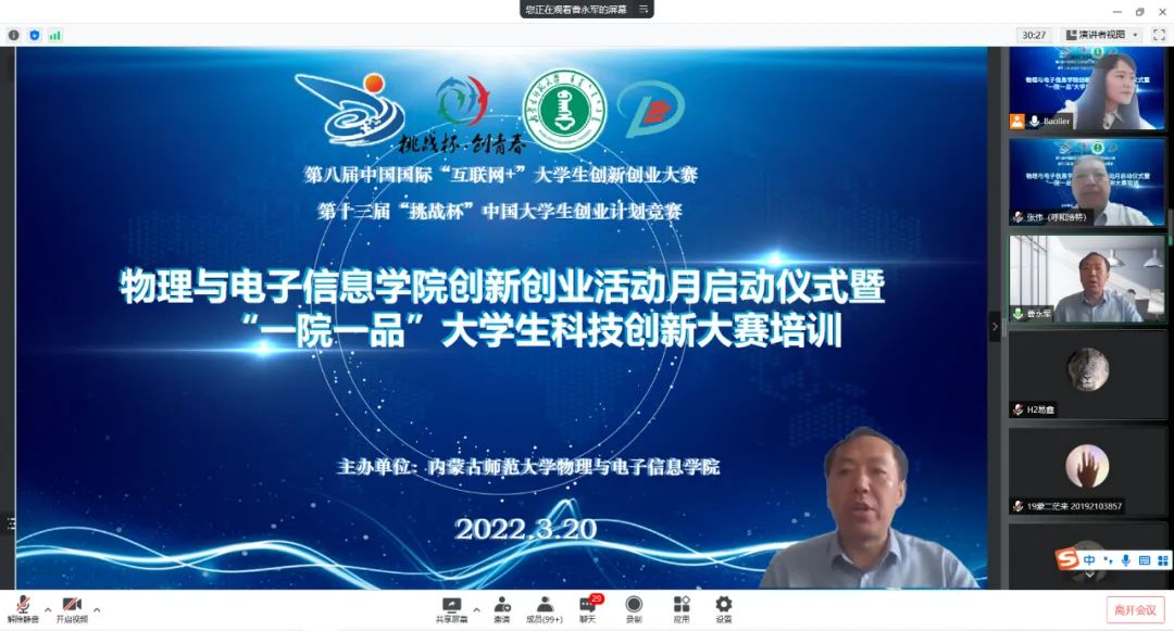 2022年政府工作报告提到:深入实施创新驱动发展战略,巩固壮大实体经济根基。推进科技创新,促进产业优化升级,突破供给约束堵点,依靠创新提高发展质量。扎实做好高校毕业生等重点群体就业工作,推进大众创业万众创新。为积极响应国家号召,引导和激励我院学生崇尚科学、追求真知、勤奋学习、锐意创新的精神,提高同学们的创新素质和实践能力,选拔优秀作品参加第八届中国国际“互联网+”大学生创新创业大赛、第十三届“挑战杯”中国大学生创业计划竞赛以及其他学术科技竞赛奠定良好基础,3月20日上午,我院师生相聚云端,线上举办yl6776永利集团2022年创新创业活动月启动仪式暨“一院一品”大学生科技创新大赛培训。学院党委书记刘美玲、院长曹永军、副书记兼副院长张伟、副院长那日苏、、物理系主任朝克夫、副主任孙咏萍、王彦、电子系主任梁学军、副主任包秀荣、张珏、材料系主任包黎红、副主任塔娜、实践创新部副主任杨帆、综合办主任兼大学物理教学部主任张天臣、学就办副主任王乐等领导老师出席,学院各年级学生共300余人参加启动仪式。启动仪式由我院团总支副书记宝力尔主持。
