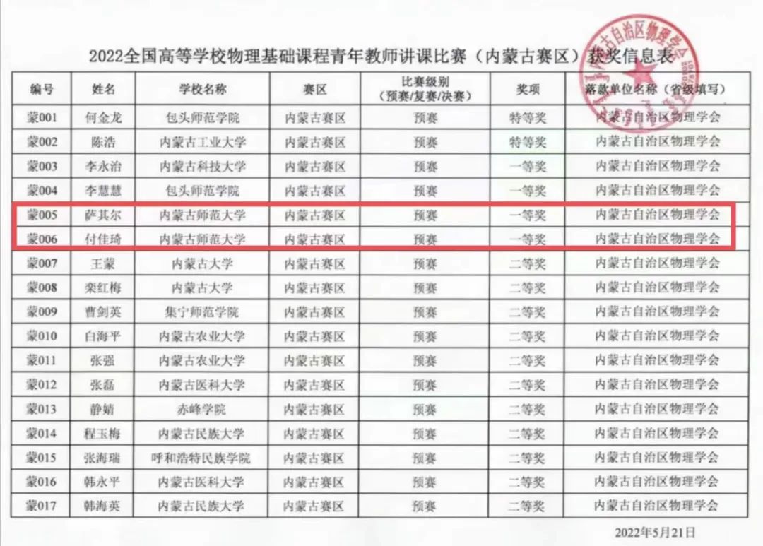 本次获得特等奖的包头师范学院的何金龙老师和内蒙古工业大学的陈浩老师将推荐参加华北地区高等学校物理基础课程青年教师讲课比赛。