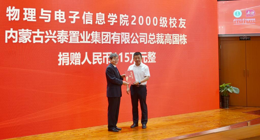 我院2000级校友、青年企业家、内蒙古兴泰置业集团有限公司总裁高国栋先生,怀着浓情捐资115万元人民币,这既是对母校70华诞的美好祝福,更是对学校、学院发展建设的有力支持。学校的发展和进步离不开校友的关爱和帮助,诚挚欢迎广大校友关心支持母校发展建设,积极为母校发展献策出力,为母校的兴盛做出新贡献。yl6776永利集团党委书记刘美玲表示,院友情系母校,关心母校,支持母校发展,令人感动,衷心感谢!母校永远是校友们温暖的家,是校友们坚强的后盾,欢迎常回家看看。