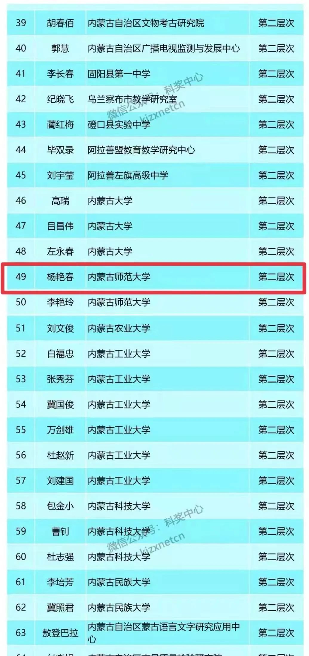 按照《关于开展2021年自治区新世纪321人才工程第一、二层次人选考核选拔工作的通知》(内人社办发〔2021〕217号)有关要求,经各地区各部门申报推荐,自治区人力资源和社会保障厅组织专家评选,自治区新世纪321人才工程领导小组成员单位会议审议,我院杨艳春、伊博乐两位老师入选2021年度自治区新世纪321人才工程第二层次人才。