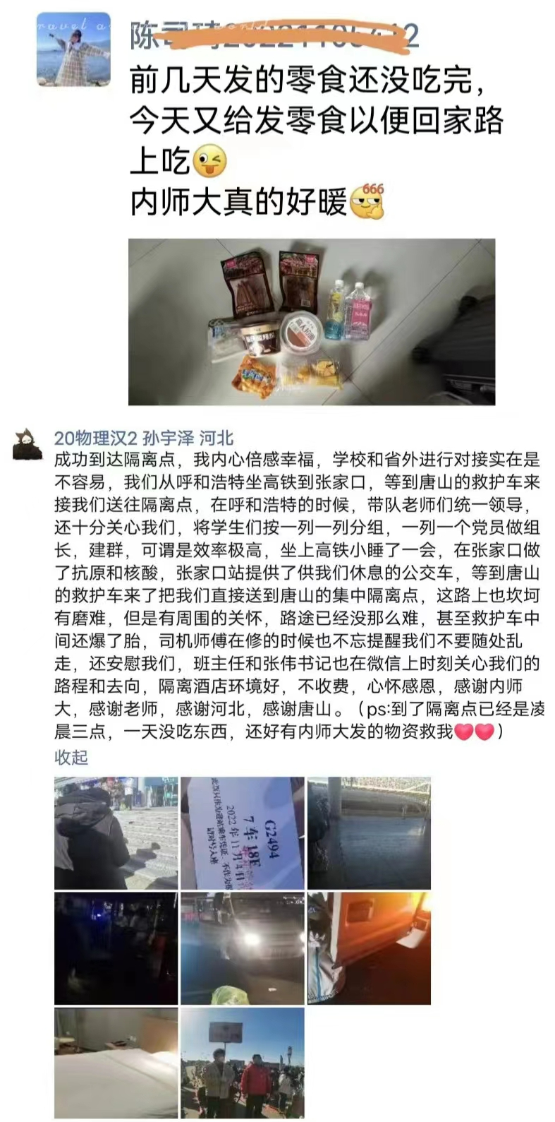 感谢党和政府,自呼市疫情以来,我受到了来自学校和两地政府的关心和照顾,为我们开专列,送我们回到家乡,上车有人送下车有人接,被安排的明明白白。当我下车踏上东北土地的那一瞬间终于忍不住流下眼泪,工作人员对我们高喊:孩子们你们到家啦!那一刻我才真正体会到了,为什么我的眼里常含泪水,因为我对这土地爱得深沉。 ——华文迪