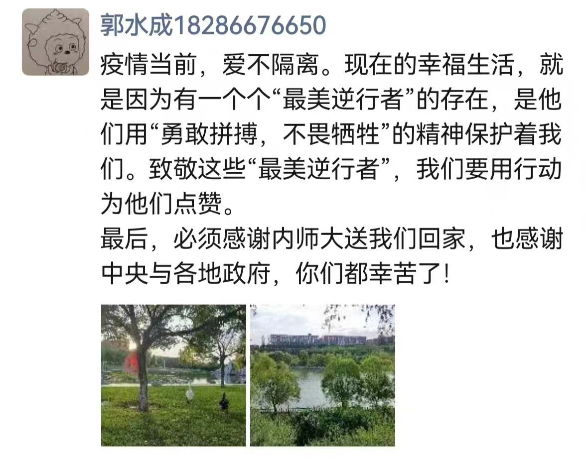 今天已经从酒店解除隔离,开始单人单户居家隔离,从疫情刚开始,我们师大的所有老师,就把学生安全放在第一位,在多方面协调下,把我们转运回家,作为首批返乡的学子,真是很感谢伟大的祖国,感谢政府,感谢我的老师,感谢所有为我们付出的工作人员,大难面前,快速反应,感谢疫情中所有逆行人,筑起防疫长城,拉起爱心防线,上下同心,共克难关!已经回到家乡的同学们遵照当地执行标准,配合防疫工作,没回家的同学们也相信学校,相信政府,好好学习,胜利就在眼前。没有一个寒冬不可逾越,没有一个春天不会来临!加油,同学们。 ——米宬泽