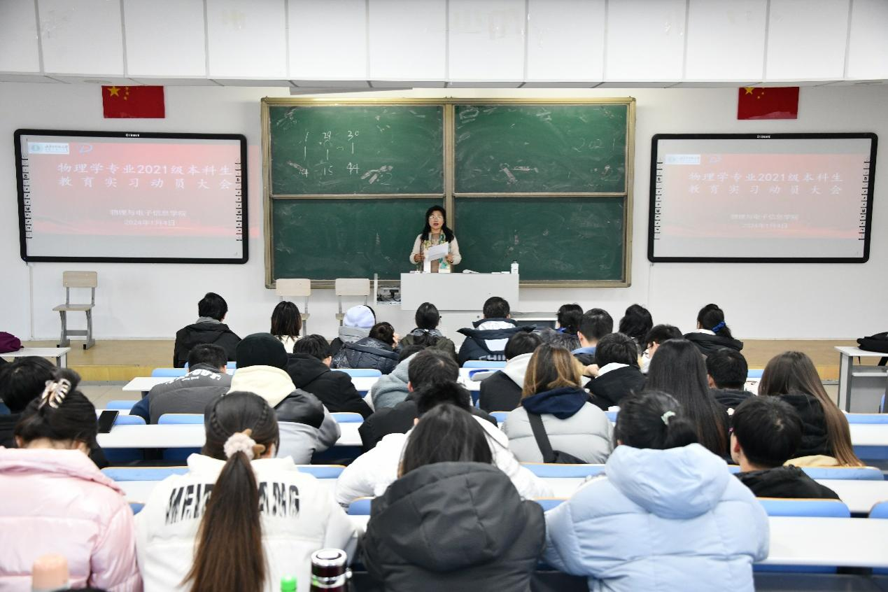 1月4日下午,我院在行知楼118召开物理学专业2021级本科生教育实习动员大会。学院副院长包黎红、负责2024年实习的校内指导老师出席会议,2021级物理学专业全部在校生参加会议,会议由物理系副主任孙咏萍主持。