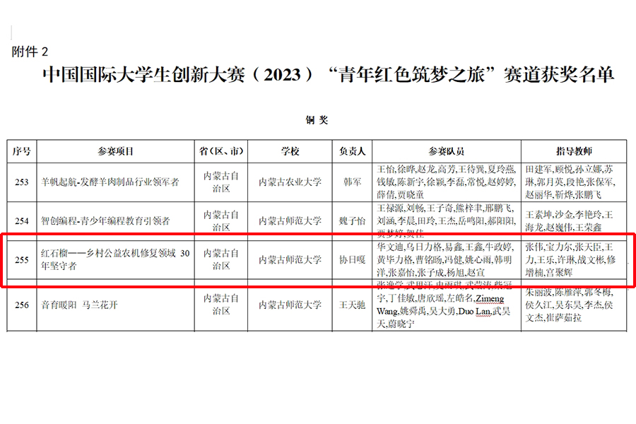 近日,教育部发布《关于公布中国国际大学生创新大赛(2023)获奖名单的通知》(教高函〔2024〕8号),我院参赛团队项目《红石榴——乡村公益农机修复领域 30年坚守者》荣获“青年红色筑梦之旅”赛道铜奖。此外,在本届大赛省赛上,我院共斩获省级金奖1项《“红石榴”科技下乡——助力农业农村现代化公益服务》、银奖3项(防“冻”未然——冻土检测先行者、草立方——牧草补光生长方案开创者、LED混色光源对蓝莓苗木生长及生理特性的影响)、铜奖1项(碳求真理,碳缩未来)。