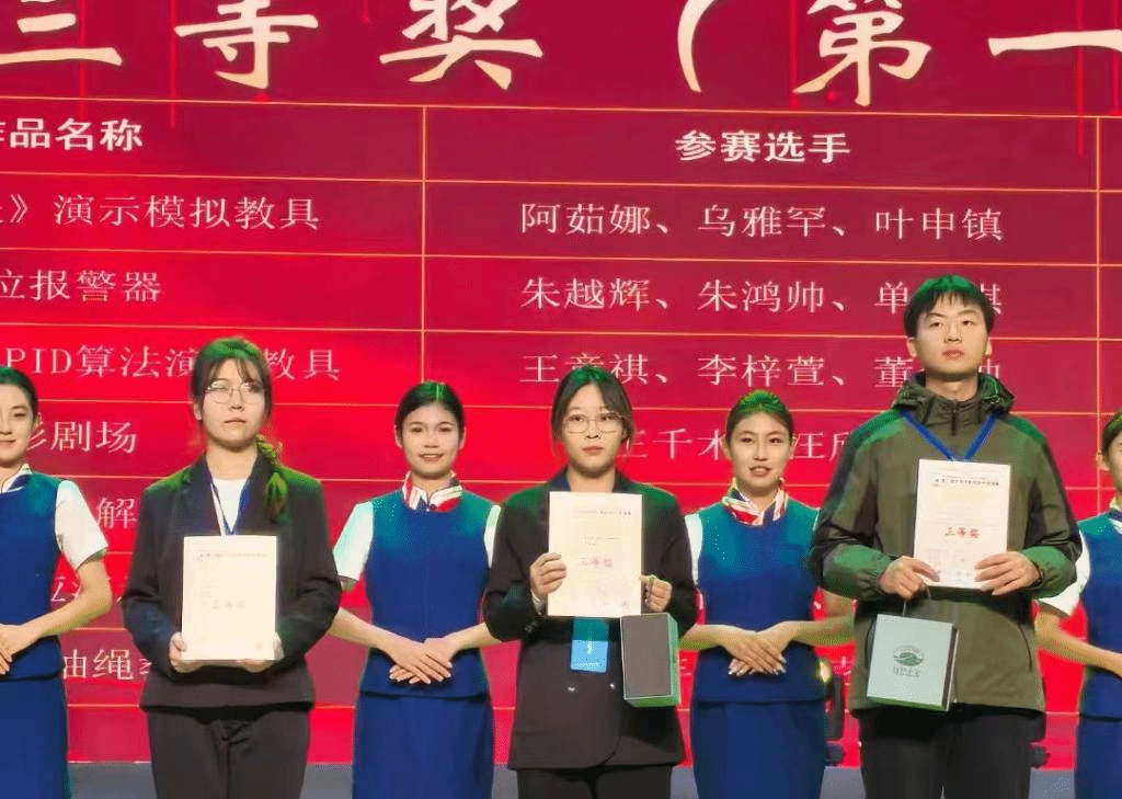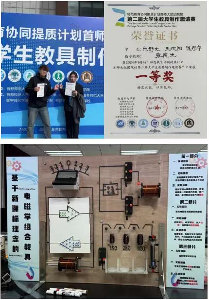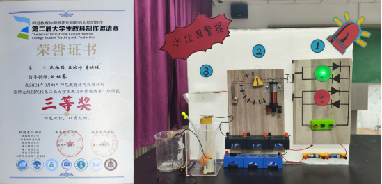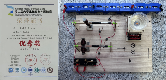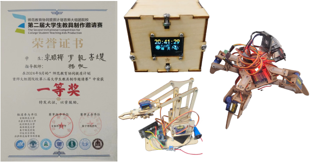 本次比赛旨在加强师范教育协同提质计划首师大组团院校之间的深入交流,着力提升师范生的创新精神和实践能力,推动本科教育教学水平的不断提高。竞赛分为初赛和复赛两个阶段,通过线上提交和现场实物演示的方式进行评比。经过激烈角逐,我院共有5项作品成功晋级决赛,在参赛过程中同学们展现出优异的创新实力和竞赛实力,每一件作品都凝聚了参赛学生的智慧和汗水。最终,由张院生老师指导、乐舒文等制作的“基于新课标理念的自制电磁学组合教具”获得一等奖,由杨帆老师指导、宋硕楠等制作的“星火燎原系列教具”获得一等奖;由杨帆老师指导、成佩轩等制作的“助聋5G机械臂教具”获得三等奖,由张林睿老师指导、朱越辉等制作的“水位报警器”获得三等奖;由张院生老师指导、唐铭浩等制作的“自制电动机—涡旋”获得优秀奖。