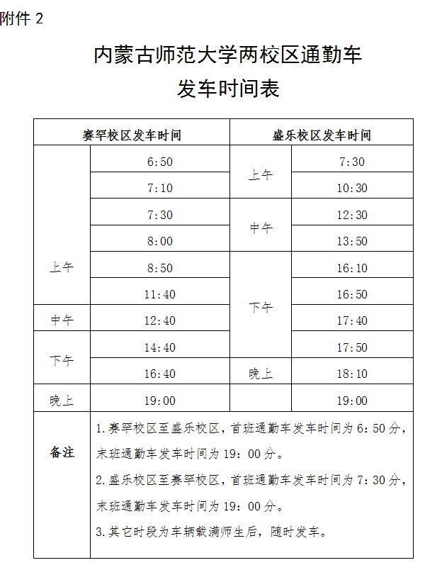 2.两校区发车时间: 赛罕校区早始发车时间为6:50;末班车发车时间为19:00。 盛乐校区早始发车时间为7:30;末班车发车时间为19:00。其他通勤车发车时间安排详见附件2:永利官网两校区通勤车发车时间表。
