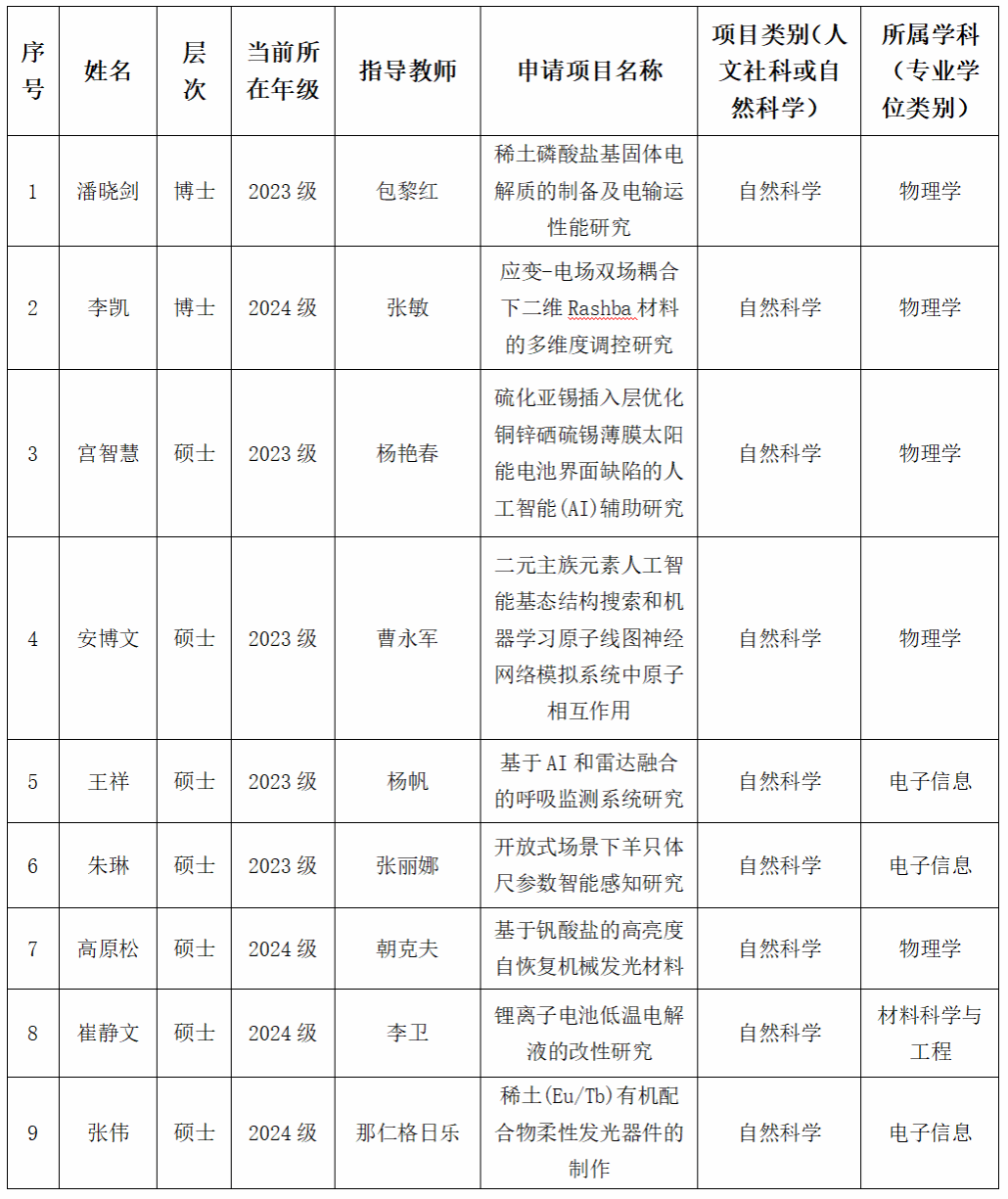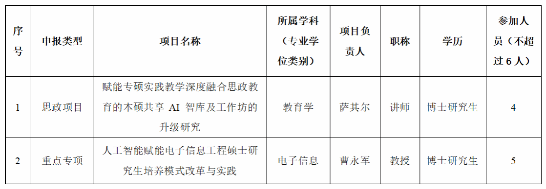 根据《关于开展2025年研究生教育项目申报工作的通知》要求,依照自治区《内蒙古自治区研究生教育教学改革项目管理办法》《内蒙古自治区研究生科研创新项目管理办法》《内蒙古自治区研究生精品课程建设项目管理办法》《内蒙古自治区研究生联合培养基地建设管理办法》等文件精神,经本人申请、学院初审,学院评审小组评议决定,拟推荐以下项目。为了体现公平、公正、公开的原则,现对拟推荐项目予以公示。