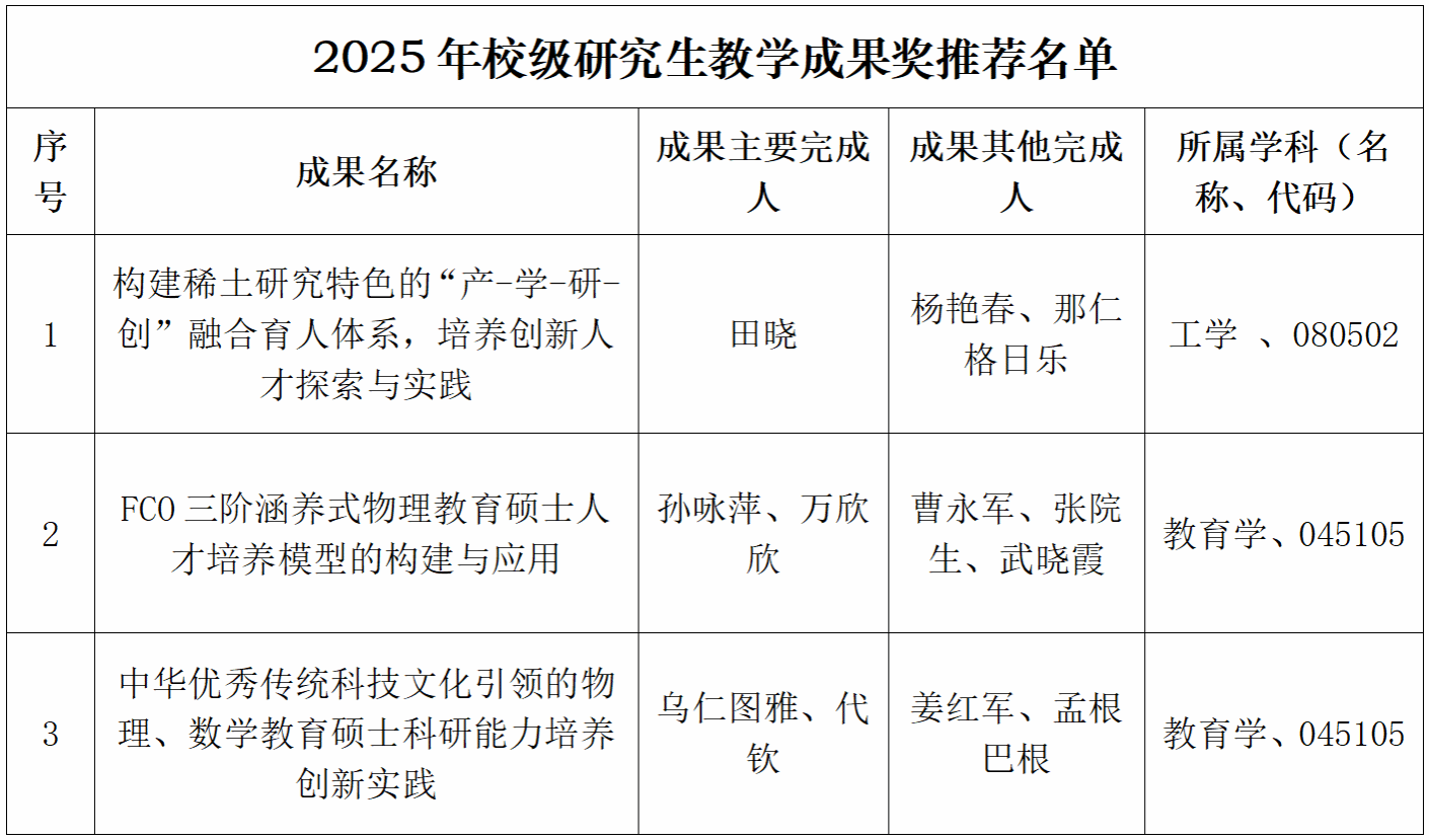 根据 《关于开展2025年校级研究生教学成果奖评选工作的通知》,通过个人申报、学院审核、初审,我院拟推荐名单如下: