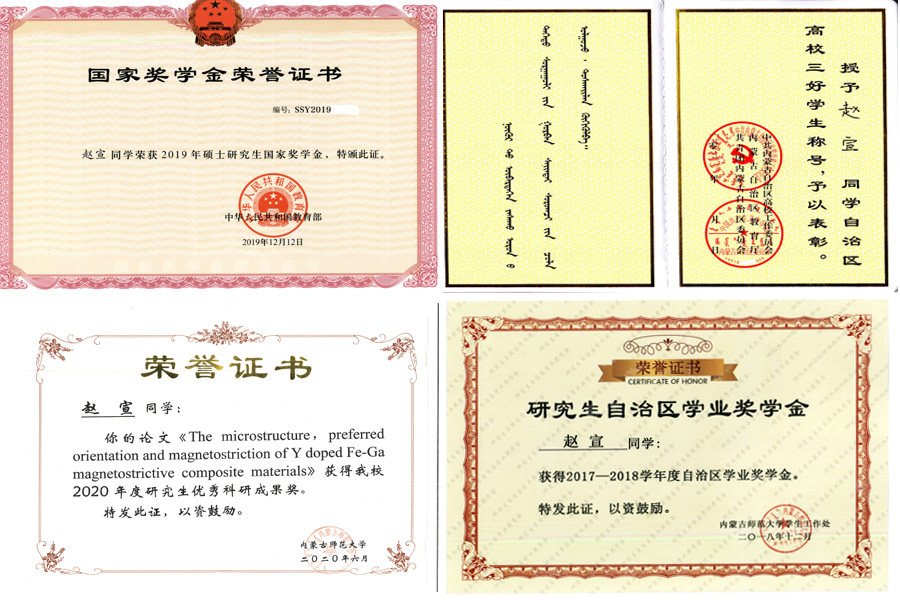 读研期间,赵宣参与了有关磁致伸缩材料领域的国家自然科学基金和内蒙古自治区自然科学基金项目各1项。他不仅仅关注自己研究的磁致伸缩材料,同时也对课题组的新能源材料感兴趣,他还参加了内蒙古自治区2017年大学生创新创业训练计划——《Mg2Ni储氢合金的固相烧结及其球磨改性研究》项目,项目小组的五位成员对Mg2Ni储氢合金的固相烧结及其球磨改性进行了详细的研究。“合理的人员搭配,也让我们能通过讨论解决所遇到的难题。以这些前提为基础,小组成员严谨的治学态度,细致的实验分析,以及极大的热情和精力的投入,使得这个项目得以顺利进行,并最终取得了不错的成果。”他说,项目的最终成功离不开项目组的通力合作。在良好的团队合作氛围的感染下,赵宣也收获了2019年度研究生国家奖学金,这更加激励自己不断学习,积极进取,为实现人生目标而不懈奋斗。