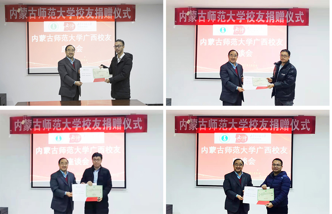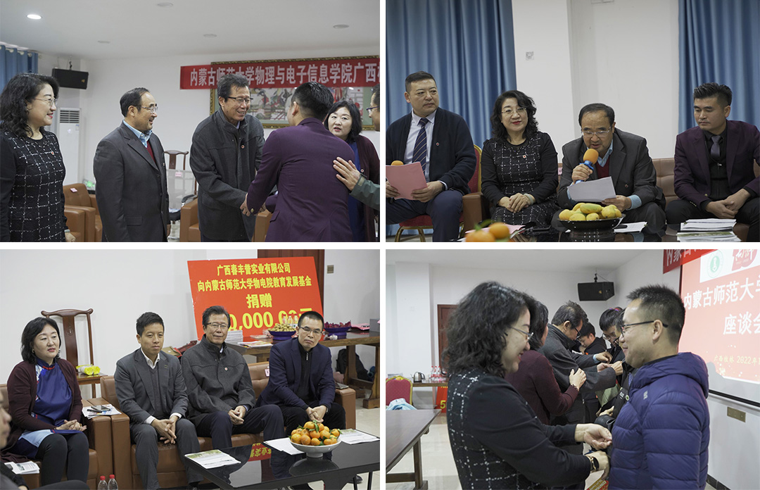 1月6日,永利官网七十周年校庆捐赠仪式暨广西校友座谈会在广西春丰誉实业有限公司举行。我校党政办主任、校庆办公室常务副主任特格希,教育发展基金会理事长梁栋才,校友会秘书长高娃,yl6776永利集团党委书记刘美玲,学院办公室主任张天臣等出席仪式,桂林市教育局教研室主任王峰研究员,广西桂林觅源纪食品有限公司总经理陶文博,广西春丰誉实业有限公司董事长王春以及我校在桂工作的校友代表20余人参加,yl6776永利集团党委副书记、副院长张伟主持仪式。