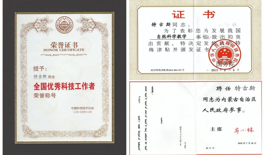 特古斯老师合作发表科研论文200余篇,其中有《Nature》1篇, 《Physical Review Letters》1篇,《Physical Review X》1篇, 论文被引用4000多次。2010年被评为自治区有突出贡献的中青年专家,自治区优秀科技工作者;2010年被评为全国优秀科技工作者;2011年入选内蒙古“草原英才”;2013年被评为国务院政府特殊津贴专家;2013年获蒙古国国立大学名誉博士称号,2013年至2017年任教育部高等学校物理学专业教学指导委员会华北地区工作委员会委员。荣获2016年-2017年度学校“爱岗敬业”先进个人,2017年-2018年度学校“教书育人”先进个人。2018年获评自治区级蒙语授课物理学课程教学团队,任团队负责人;2018年被聘为内蒙古人民政府参事;2019年被聘为中国稀土学会稀土磁制冷材料与技术专业委员会副主任委员。2019年科研成果《多元稀土六硼化物LaxCe1-xB6微结构及电子发射机理研究》获内蒙古自治区自然科学三等奖。