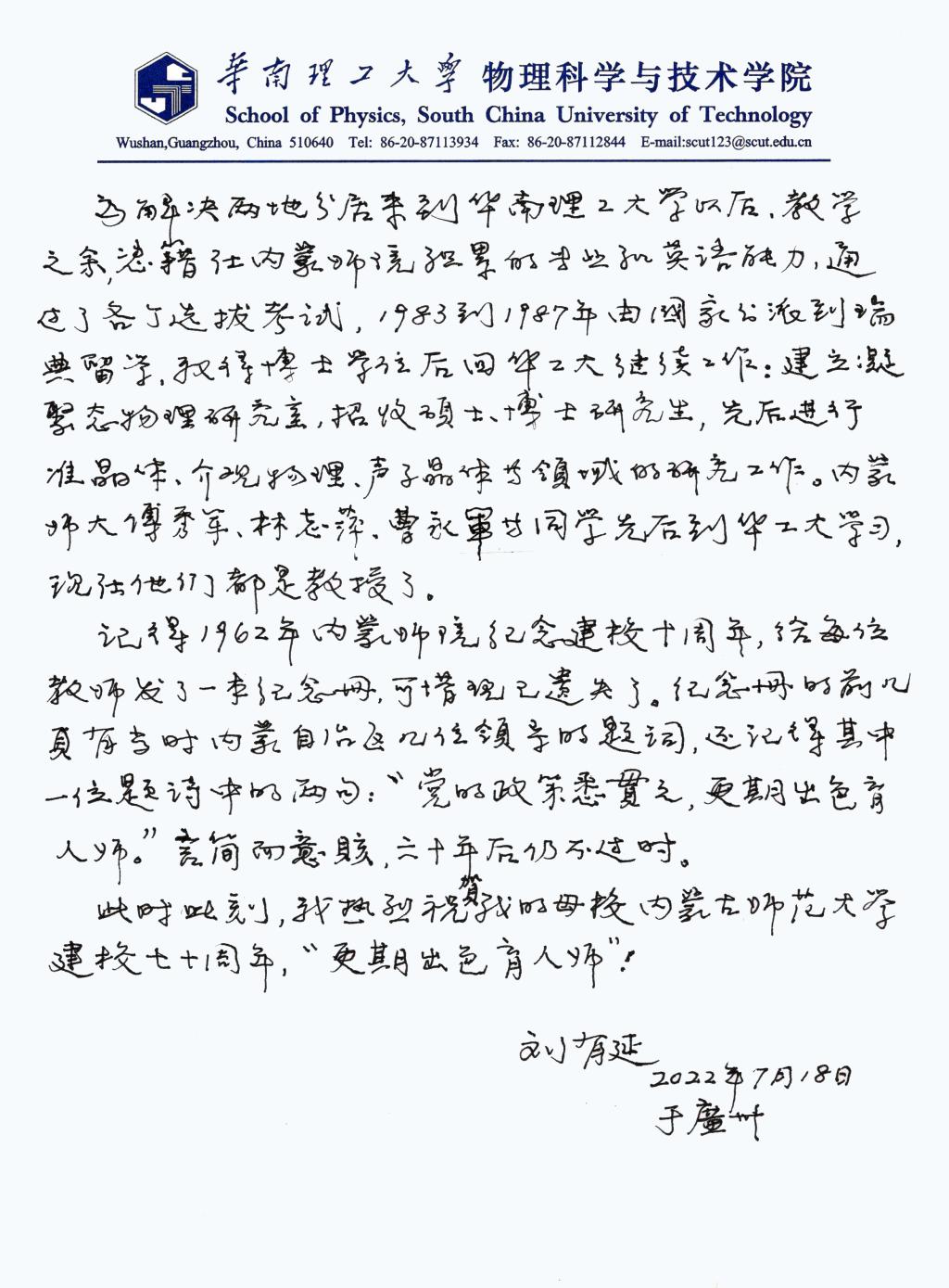 值此永利官网建校七十周年校庆之际,刘有延老师特来信祝贺母校建校七十周年华诞。