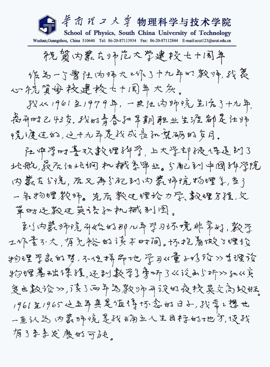 到了内蒙师院开始的那几年,学习环境非常好,教学工作量不大,有充裕的读书时间,怀抱着做理论物理学家的梦,不但拼命地学习《量子场论》等理论物理基础课程,还到数学系旁听了《泛函分析》和《实变函数论》,读了两年为教师开设的夜校英文高级班。1961至1965年这五年真是值得怀念的日子。我常常想也一直认为内蒙师院是我确立人生目标的地方,使我有了未来发展的可能。