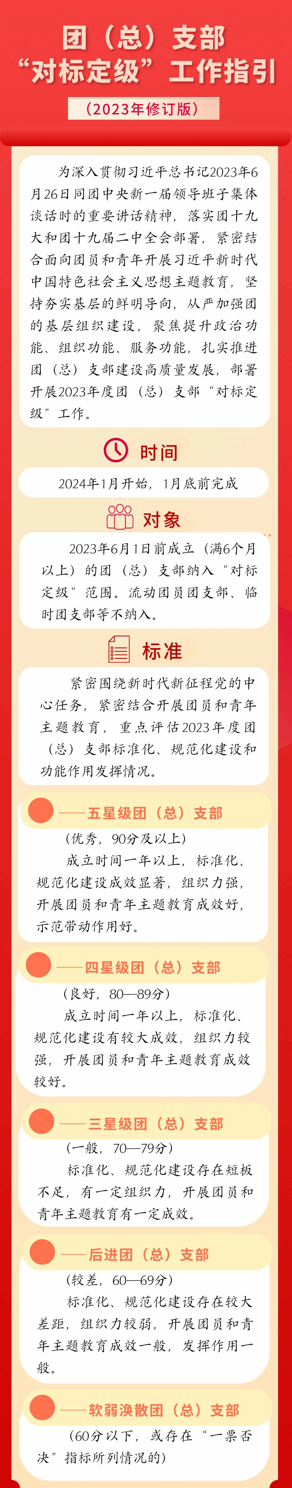 2023年团(总)支部“对标定级”应紧密围绕新时代新征程党的中心任务,坚持围绕中心、服务大局,积极主动对接国家重点战略和重大任务,重点在理论学习(含宣讲)、经济发展、科技创新、乡村振兴、民主法治、文教体育、绿色发展、社会服务、应急处突、卫国戍边、统一战线、对外交流等领域争当排头兵和生力军,激发团员青年在中国式现代化建设中挺膺担当。重点评估2023年度团(总)支部标准化、规范化建设和功能作用发挥情况(参考标准见附件),实行百分制赋分评定,各项指标分别赋分。对应星级参考如下: