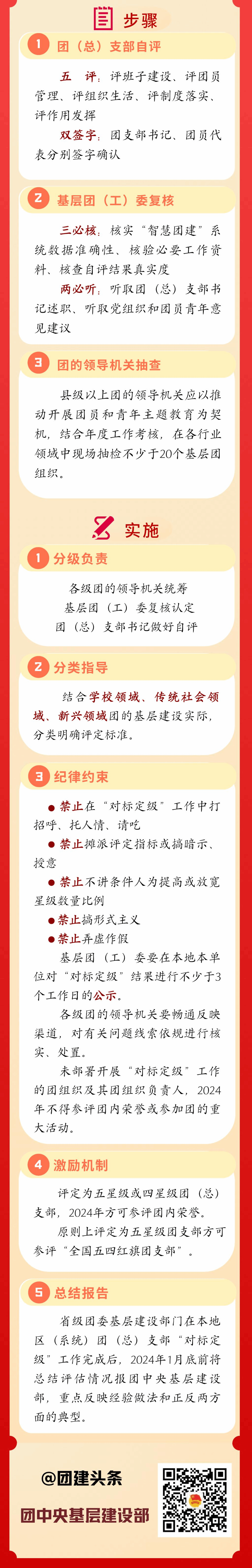 各级团的领导机关统筹本地区(系统)团(总)支部“对标定级”工作。基层团(工)委严格复核认定,既不刻意拔高、也不降格以求。团(总)支部书记负责做好自评,主动向本支部本单位的团员青年公开结果。评星定级以线下开展为主,线上依托“智慧团建”系统同步记录,线下线上不能相互替代。