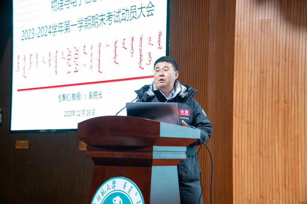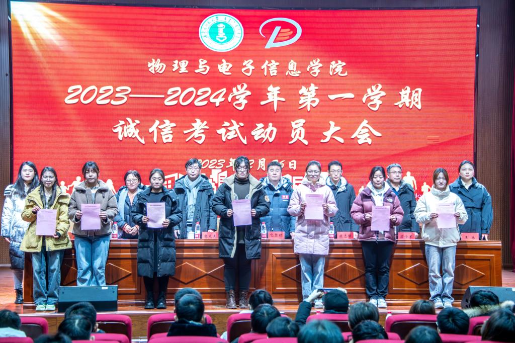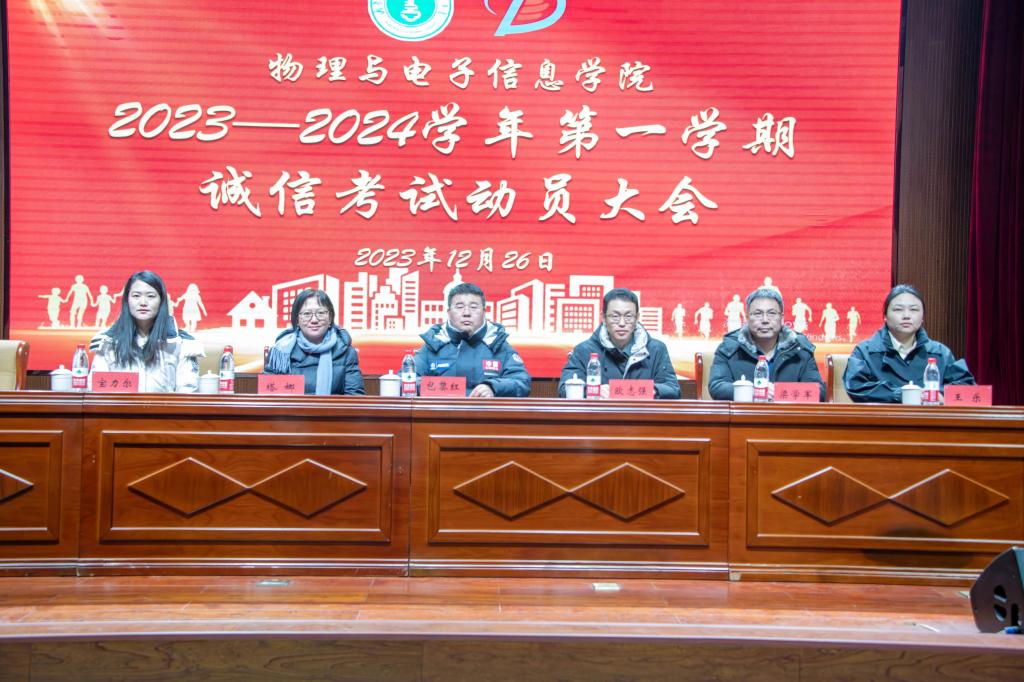 为培养学生的诚信意识,端正学生对学习和考试的态度,提高学生对校规校纪的理解,严格遵守考试规章制度,营造积极向上的考试氛围,进一步推进公平公正的考风考纪,12月26日下午,我院召开2023—2024学年第一学期诚信考试动员大会。学院副院长包黎红,党委副书记、副院长欧志强,物理系主任朝克夫,电子系主任梁学军,材料系副系主任塔娜,学就办副主任王乐,团总支副书记宝力尔,2023级班主任代表,辅导员出席会议,2023级本、硕学生400余人参加会议,会议由学院党委副书记、副院长欧志强主持。