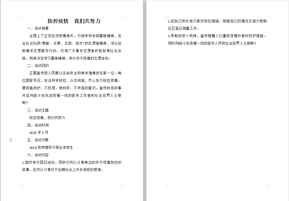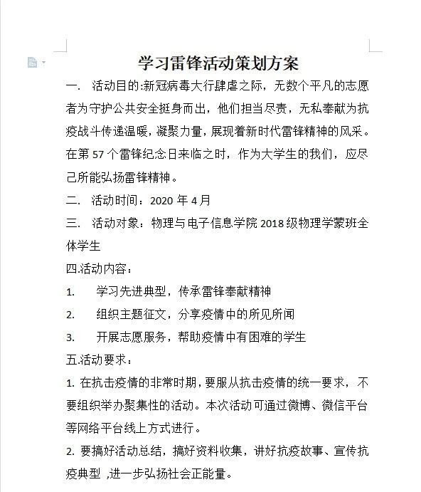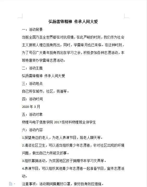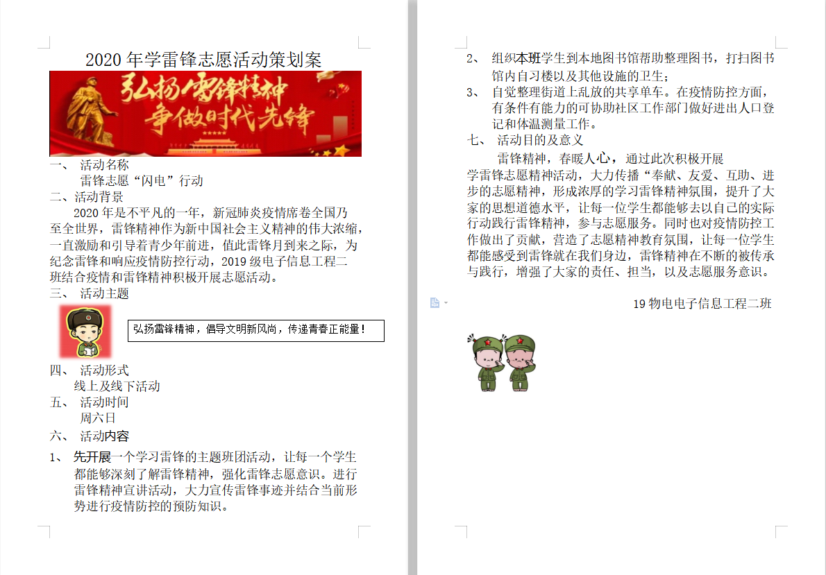 雷锋日,精神传。为引导广大青年学生正确认识雷锋精神的重要性,积极主动发挥疫情间雷锋精神的重要指导作用,不断提高大学生道德素质与爱国情怀,我院内召开学雷锋志愿活动月内的各项活动,得到院内师生的热烈响应。以下为雷锋月组织2017、2018和2019级学生以班级为单位开展志愿服务创意设计评比。