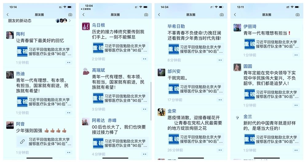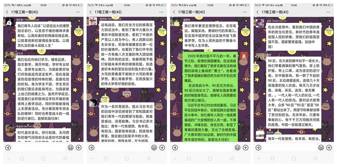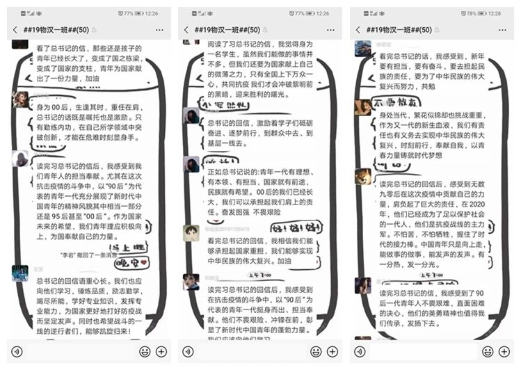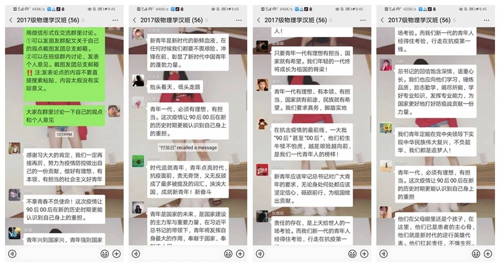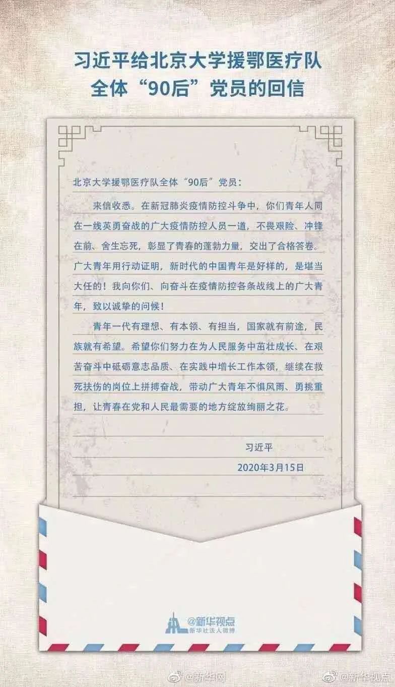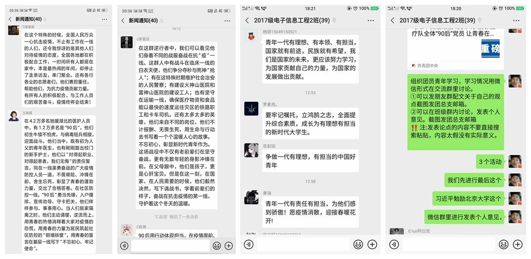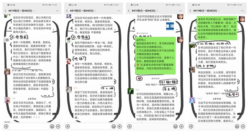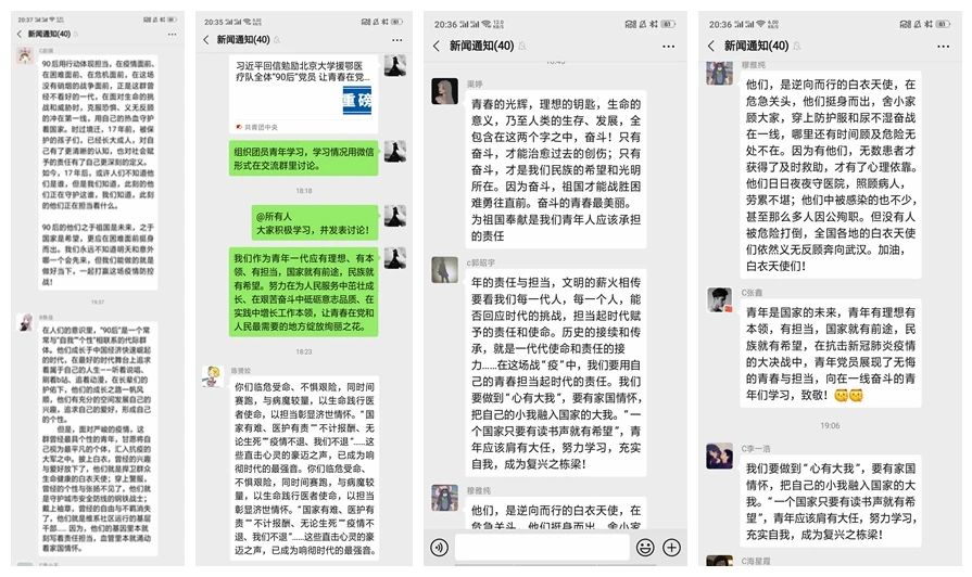 从2003年的非典,到2020年的新冠肺炎,那些躲在长辈身后的幼小生命在不知不觉长大成人,穿上防护服,带好口罩,毫不犹豫地冲向一线,逐渐消失的背影却渐渐高大。习近平总书记在3月15日给北京大学援鄂医疗队全体“90后”党员回信,肯定勉励所有抗战一线的青年工作者们。为树立榜样模范,充分学习青年工作者们在疫情中的表现担当,我院各团支部召开学习习近平总书记的回信主题团日活动。