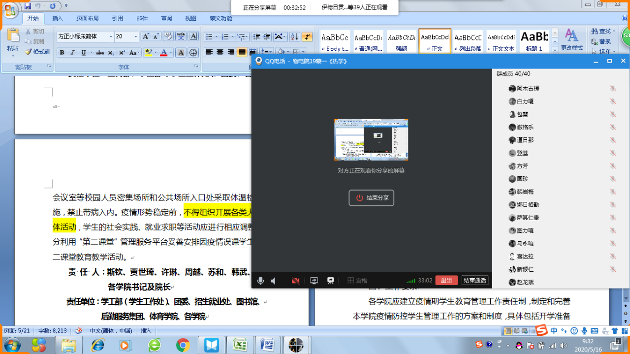 从5月13日开始,永利官网学生分批次错峰返校复学,针对开学期间的疫情防控工作部署与教学任务安排等相关事宜,我院第一批返校19级本科、研究生各团支部纷纷召开线上线下专题班会,对开学后的疫情防控与教育管理工作进行进一步布置和传达。