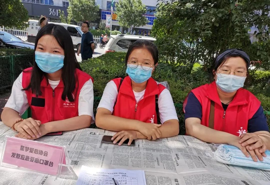 八月一日是神圣庄严的日子。中国共产党领导的人民军队走过了93个春秋。由19级物理学汉二班宋浩楠(中)及其他两名志愿者组成的大学生志愿服务小分队上午九点准时在张家口市阳原县昌盛西街中国建设银行大厅门前集合,代表星梦爱心志愿者协会,把免费提供的口罩送到来建行办理业务的顾客手中。