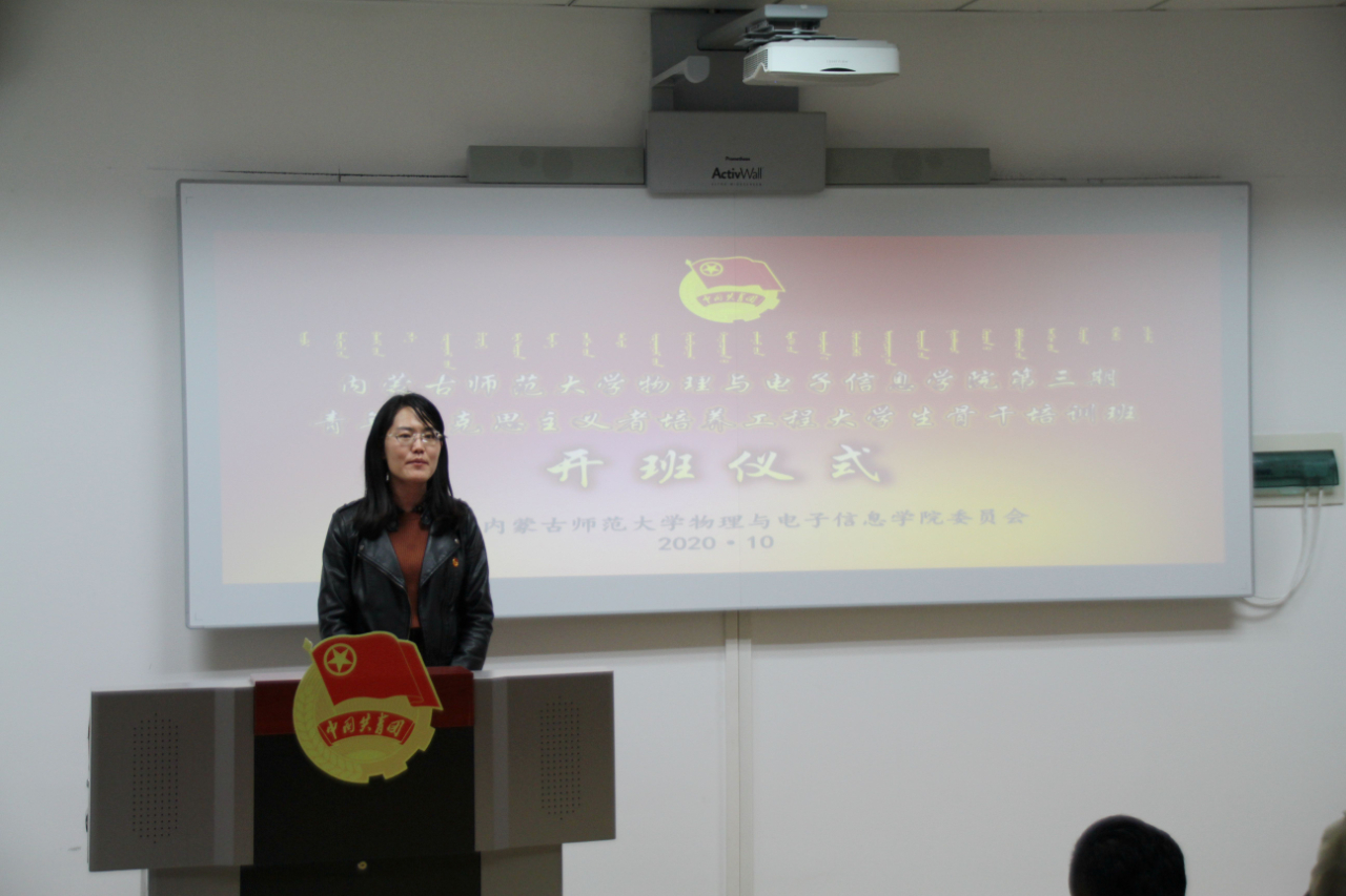 为加强我院共青团基层组织建设,深入推进团中央学校部倡导的青年马克思主义骨干培养工程,也为提升大学生骨干、团干部、青年知识分子等青年群体的思想政治素质和理论水平,我院于10月28日在理工楼A座303举行了第三期青年马克思主义者培养工程大学生骨干培训班开班仪式。开班仪式由团总支负责人宝力尔老师主持,学就办副主任王乐老师、辅导员宋鑫伟、包文泉老师及我院学生会干部、班、团干部参会。