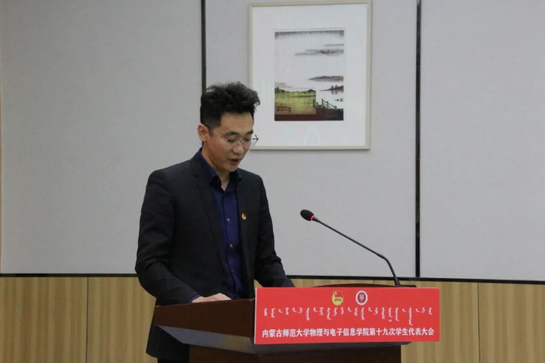 校团委青年发展部副部长孟伟东老师代表校团委首先对我院团学工作给予了充分肯定,其次从坚定理想信念、培育高尚品格,、练就过硬本领三个方面向我院广大青年学生提出了建议和希望。他希望,青年学生代表在团组织的带领下,以此次学代会为契机,紧跟中国共产党的脚步,不忘跟党初心,坚守青春使命,在新中国前进的道路上展现永利官网物理与电子信息学院的风采。
