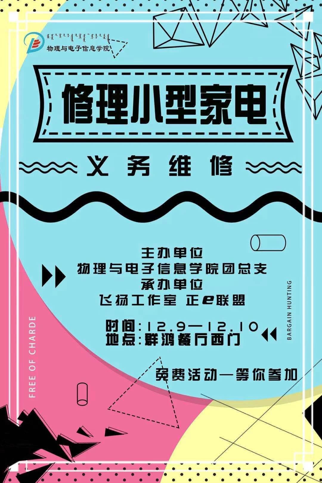 由yl6776永利集团团总支主办,飞扬工作室与学生社团正e联盟承办的小型家电义务维修活动将于十二月九号到十号中午在群鸿餐厅西门举办,有需要的同学可以来找我们帮忙哦!