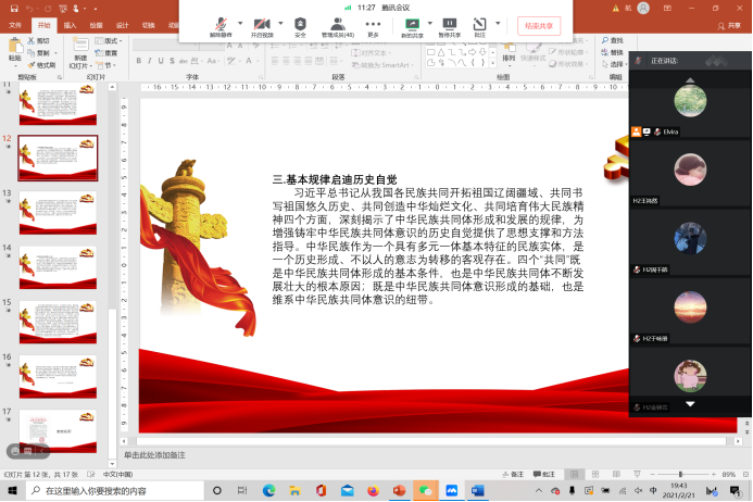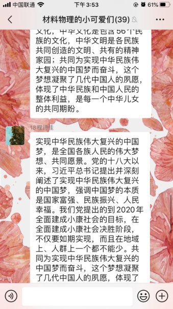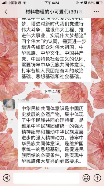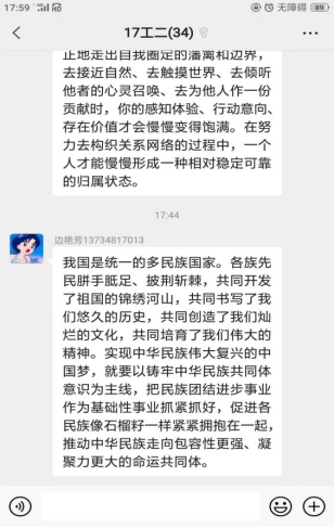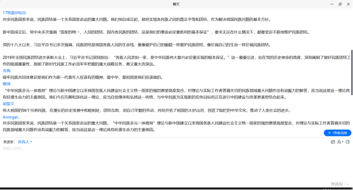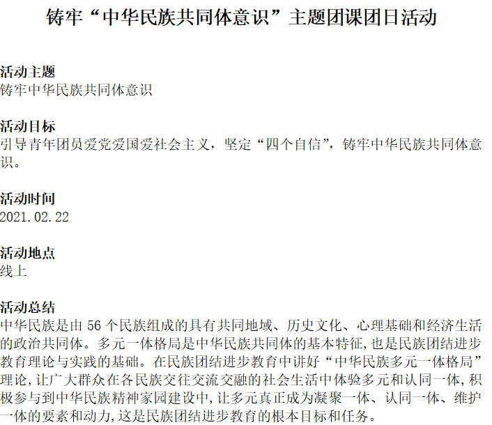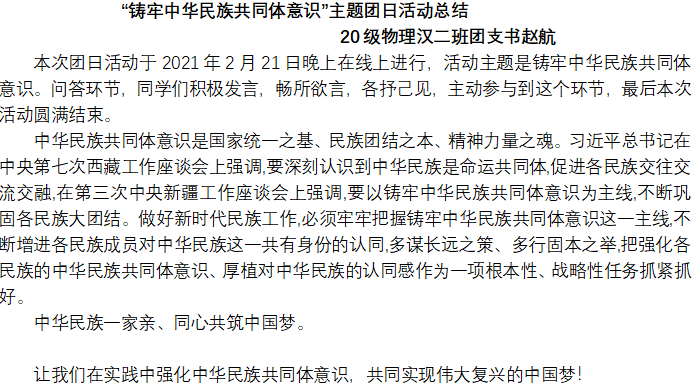 为深入学习宣传贯彻落实党的十九大精神,认真学习宣传习近平总书记在全国民族团结进步表彰大会上的重要讲话精神,引导广大师生进一步凝聚“民族团结一家亲,同心共筑中国梦”的强大合力。自2月19日至2月23日,yl6776永利集团在全院学生中开展了“铸牢中华民族共同体意识”云端主题团日活动。全院28个团支部、共1092人参与活动。活动中同学们直抒胸臆,积极发表对“铸牢中华民族共同体意识”的理解和认识。本次活动旨在增强学生对伟大祖国、中华民族、中华文化、中国共产党、中国特色社会主义的认同,使中华民族共同体意识深深扎根各族师生心中。