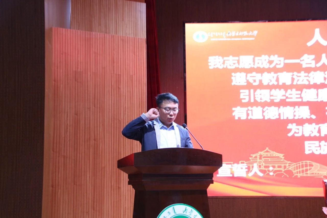接着,学院党委书记刘美玲在亲切地表达了学院对新生的欢迎和激励的同时,介绍了我校、我院的概况,并且要求同学们做自己人生的掌舵者,勇担家国责任,向同学们提出“确立理想、培养品格、适应大学、练真本领”四点希望,牢记“献身、求实、团结、奋进”的校训精神。之后,在副院长那日苏的领誓下,2021届师范生全体宣誓。会议在雄伟的校歌中落下帷幕。