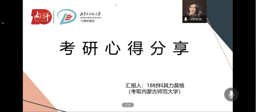 第二位宣讲人是2018级材料物理班的其力莫格,她先讲解了关于研究生考试的相关注意事项,随后给同学们分享网课老师和学习资源。她强调考研前学习环境和心态的重要性,并且与同学们分享应该如何调整自己的心态。