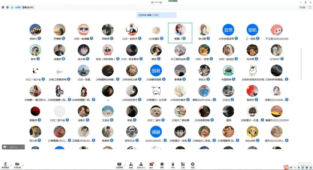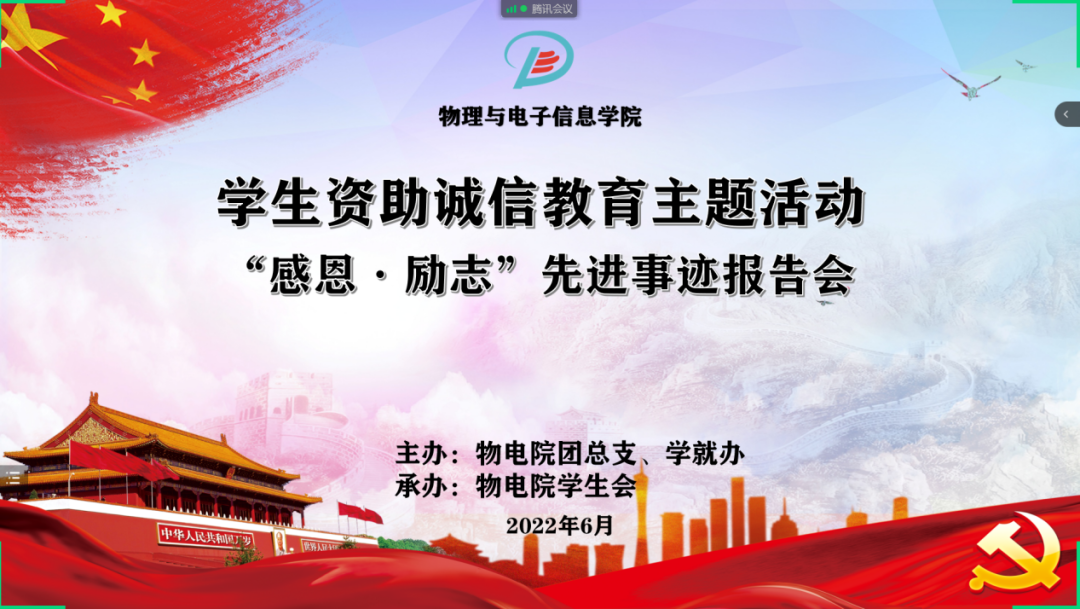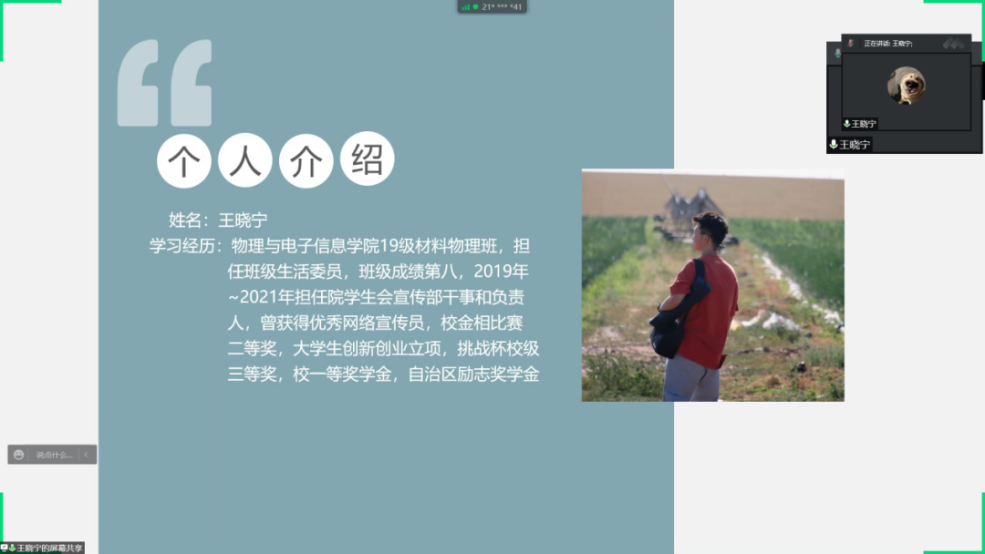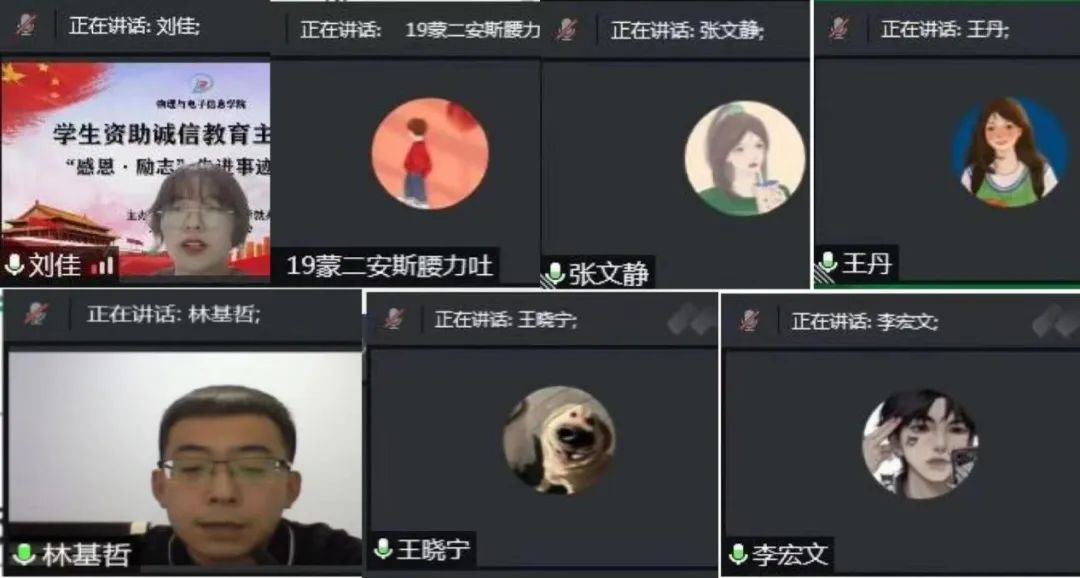 随后,我院“感恩·励志”先进事迹宣讲团依次分享他们的故事。宣讲人分别是:国家奖学金获得者——2018级汉授物理班的刘佳同学、国家励志奖学金——2019级蒙授物理班安斯腰力吐同学、国家励志奖学金——2019级电子信息工程2班张文静同学、自治区奖学金——2019级电子信息工程1班王丹同学、自治区学业奖学金——2019级物理学硕士研究生林基哲同学、自治区励志奖学金——2019级材料物理班王晓宁同学、研究生三助——2021级专硕班李宏文同学。他们用线上宣讲的形式,通过自己的亲身经历和所见所闻、所思所悟去诠释诚信教育和感恩教育的理念。