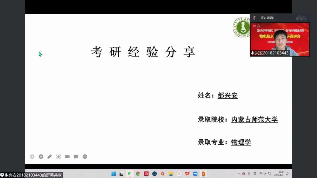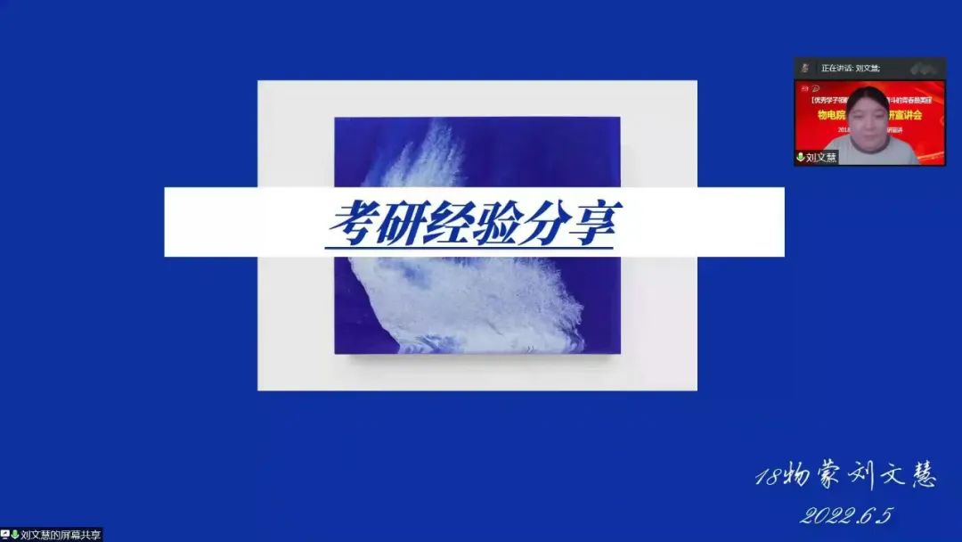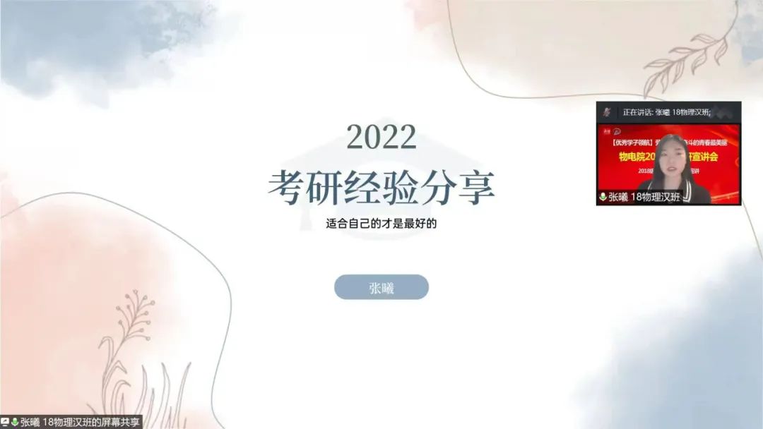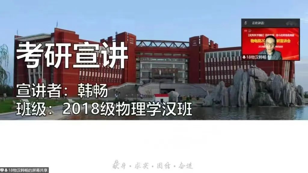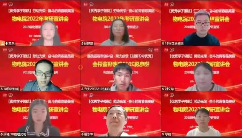 为营造良好的学风,激发学生考研的积极性,增强同学们考研的信心,6月5日晚上,我院召开【优秀学子领航】劳动光荣.奋斗的青春最美丽——物电院2022年考研宣讲会(二)2018级物理学专业考研宣讲。