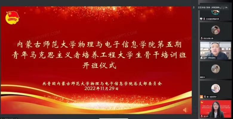 为进一步加强我院广大团员青年的综合素质,增强使命感和责任感,促进我院团员教育管理的规范化、系统化,全面推进我院青年马克思主义者培养工程,在广大青年学生中着力培养造就用马克思主义中国化的最新成果武装的马克思主义者,11月29日,yl6776永利集团第五期“青年马克思主义者培养工程大学生骨干培训班”开班仪式在线上举行。党委副书记、副院长张伟、学就办副主任王乐、辅导员吴亚楠老师出席仪式,180余名学员参加,仪式由团总支副书记宝力尔老师主持。