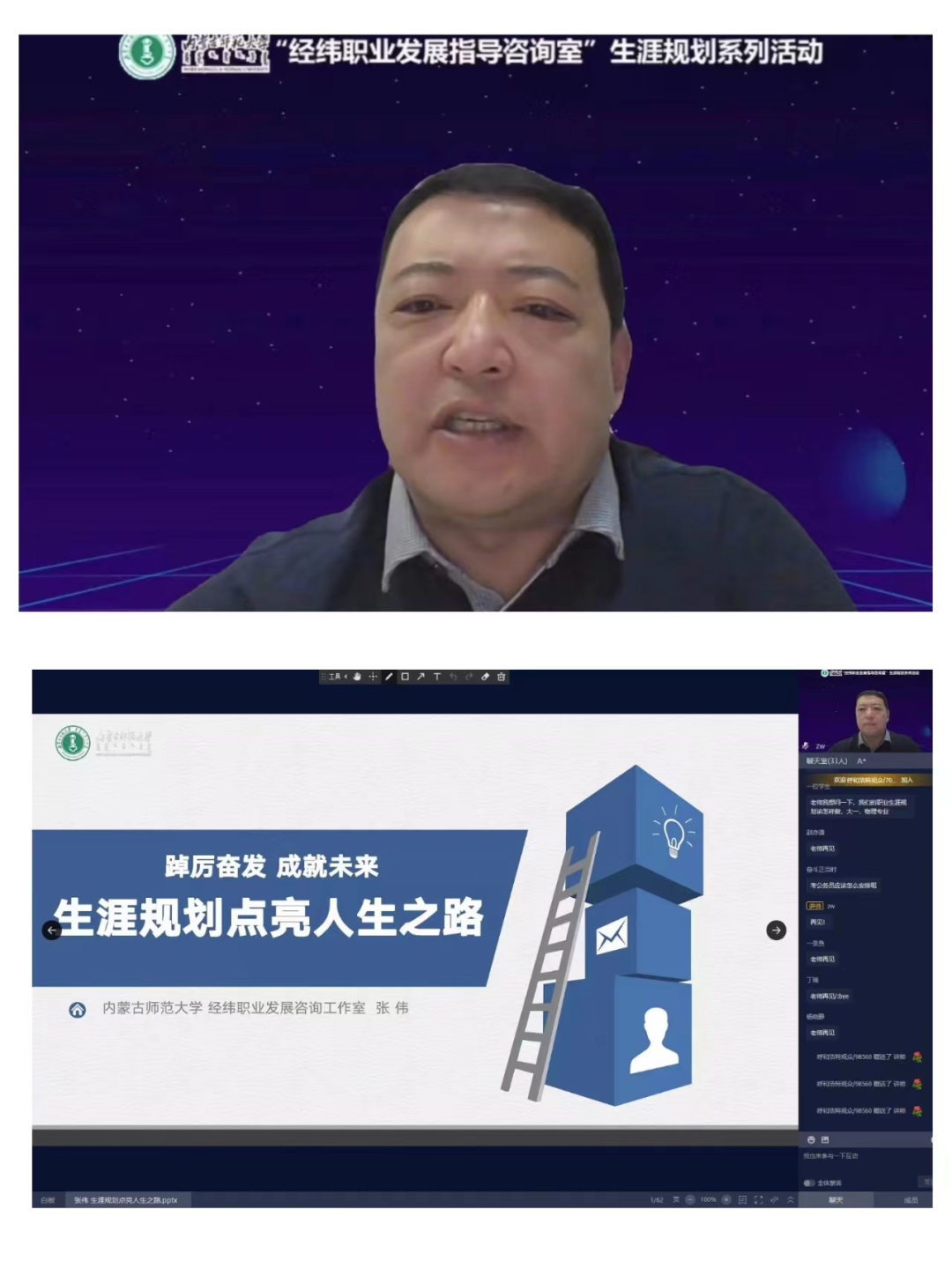 规划人生远景,描绘生涯蓝图,发挥自我才能,谱写人生华章。为引导学生更好地适应大学生活,学会科学、合理地安排学习和生活,科学规划职业生涯,提高人职匹配度,我院组织全体学生观看学习《踔厉奋发 成就未来——生涯规划点亮人生之路》讲座。