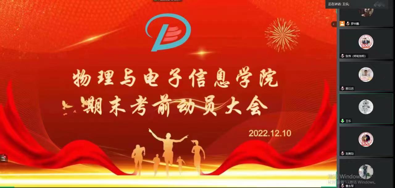 为树立我院学生诚信考试意识,端正学习心态,树立正确价值观,我院于2022年12月10日晚19:00,线上召开考前动员大会。党委书记刘美玲、院长曹永军、党委副书记、副院长张伟、副院长那日苏、团总支、学就办、2022级本科生、研究生班主任及全体学生参加。会议由学就办副主任王乐主持。