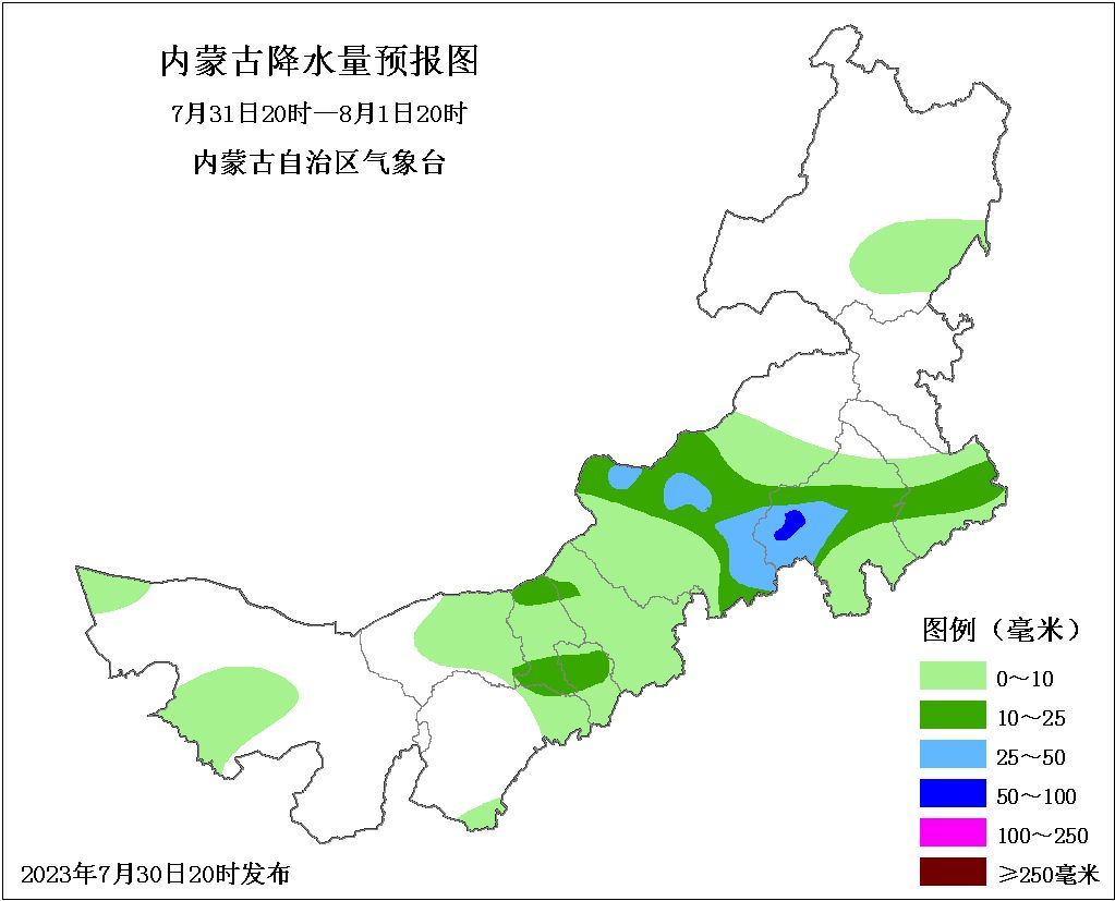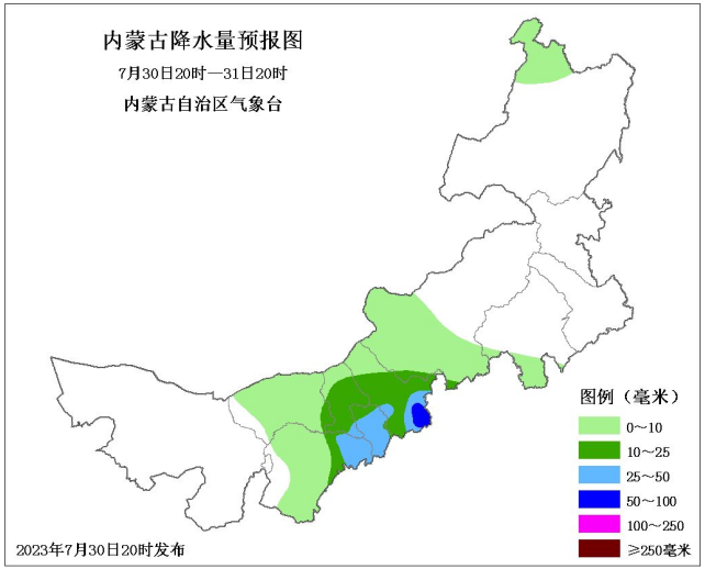 ↑↑↑ 7月31日20时至8月01日20时,预计包头市北部、呼和浩特市北部、锡林郭勒盟中部、赤峰市中部、通辽市南部部分地区有中雨,锡林郭勒盟中部、赤峰市西部有大雨,局地有暴雨。
