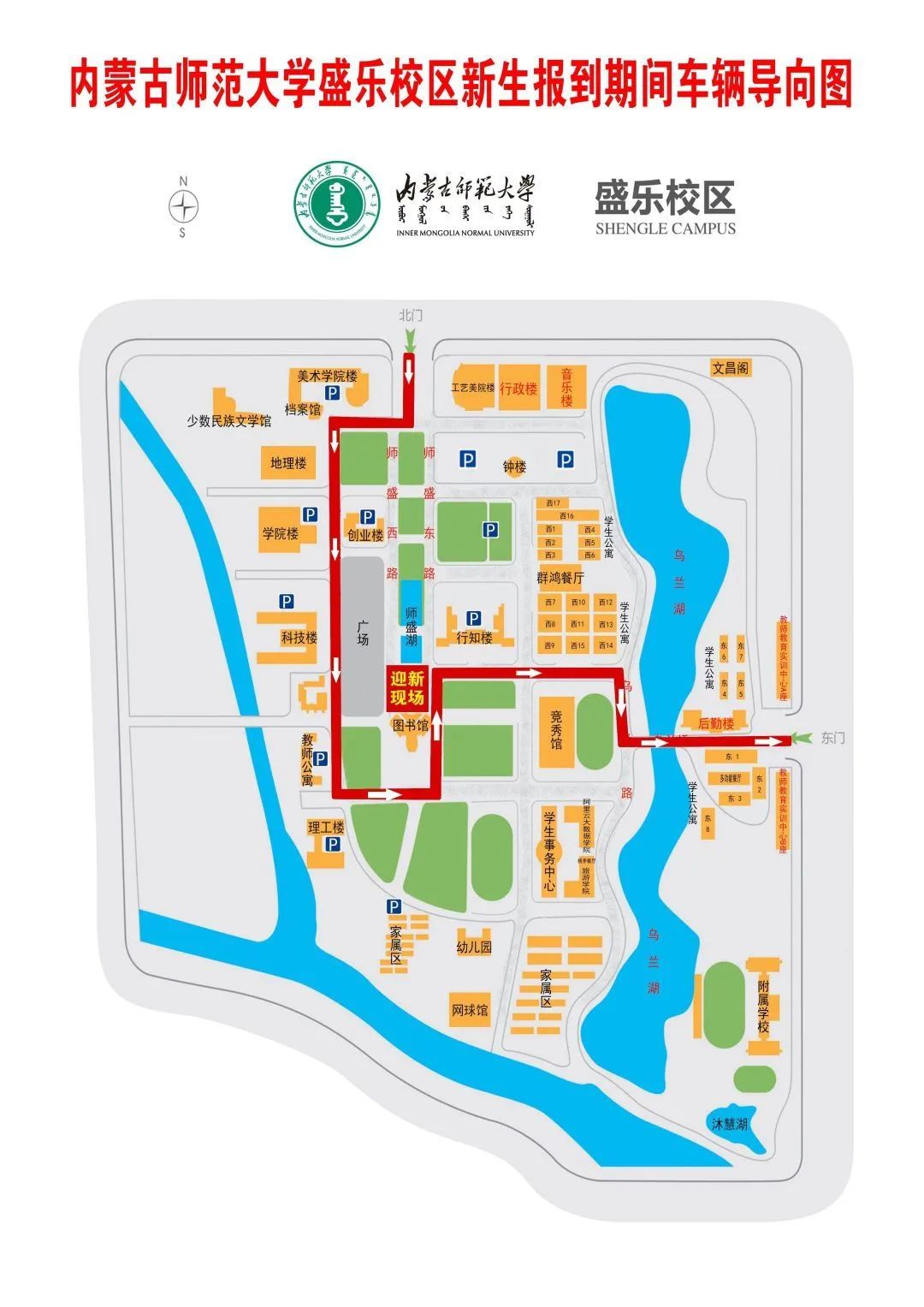 盛乐校区行人由北门、东门进入,送新生车辆统一从北门进入、东门驶出。