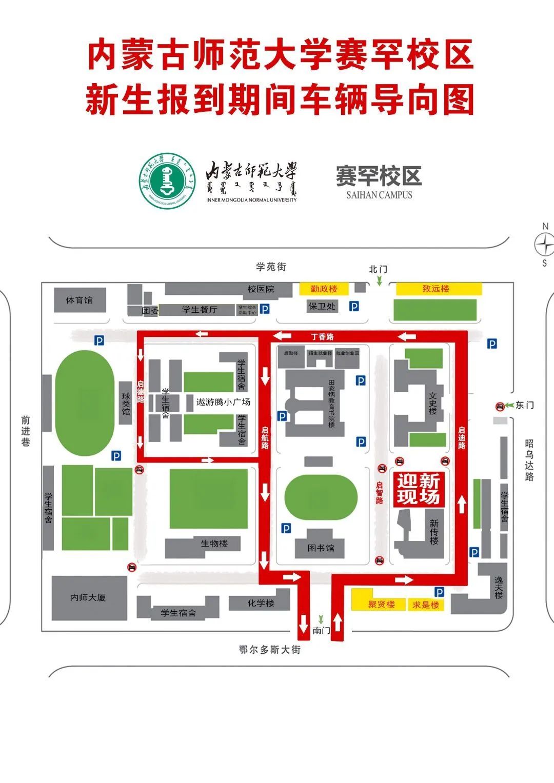 赛罕校区行人由北门、南门进入,送新生车辆统一由赛罕校区南门进入,单循环由南门驶出;