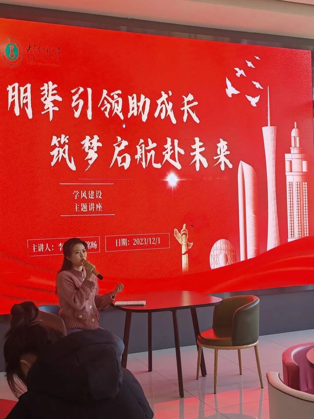 曹铭旸同学以“教师职业素养的提升”为主题,围绕“培养对教师职业的热爱之情”、“注重教学技能的提升”、“积极规划生涯蓝图”三方面与同学们进行了分享与交流。鼓励学弟、学妹们积极参加师范生职业技能大赛,充分发挥“以赛促学,以学促行”的作用,在学习理论的同时积极实践,在实践中不断提升专业素养与能力水平。