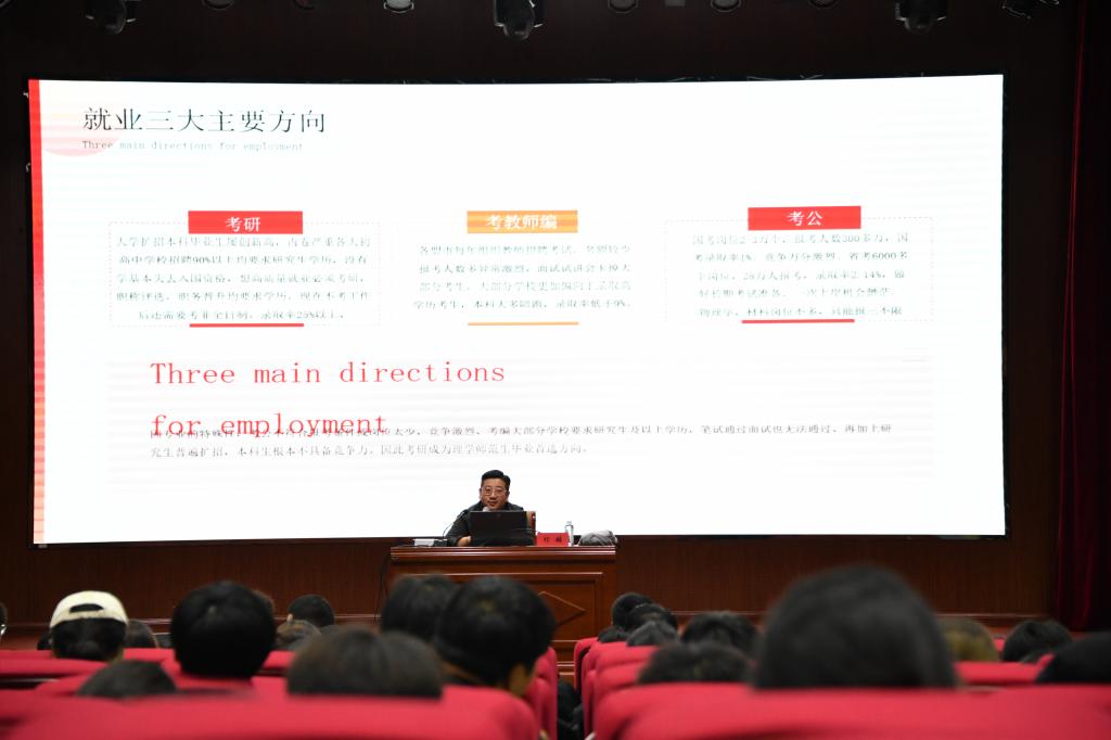 讲座伊始,祁麟老师从毕业生数量,学历层次等角度入手,向同学们讲述了就业三大主要方向,考研政策与考研全流程安排、同时介绍了考研考试内容,各科卷面结构,提醒学生提前做好考研规划。最后祁麟老师重点介绍了可考专业选择的技巧和注意事项。强调选择院校,关键要结合自身学习情况、院校情况等进行综合考虑。