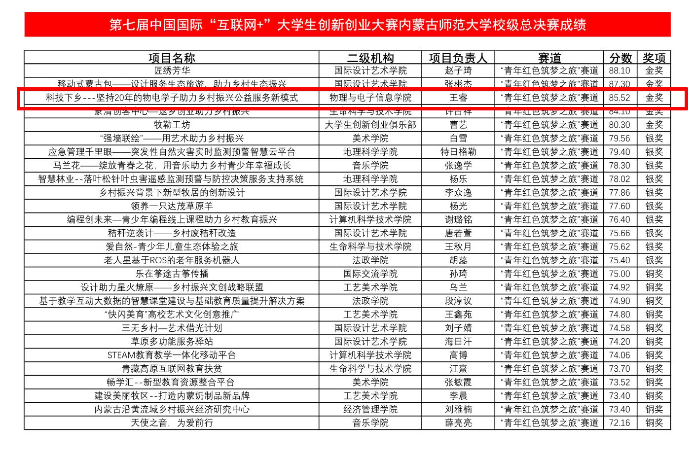 7月12日,由招生就业处主办、计算机科学技术学院承办的第七届中国国际“互联网+”大学生创新创业大赛永利官网校级总决赛在赛罕校区信息楼开赛。由我院党委副书记兼副院长张伟、辅导员宝力尔、宋鑫伟指导的《科技下乡一坚持20年的物电学子助力乡村振兴》项目荣获“青年红色筑梦之旅”赛道金奖,项目负责人为2019级材料物理班王睿。
