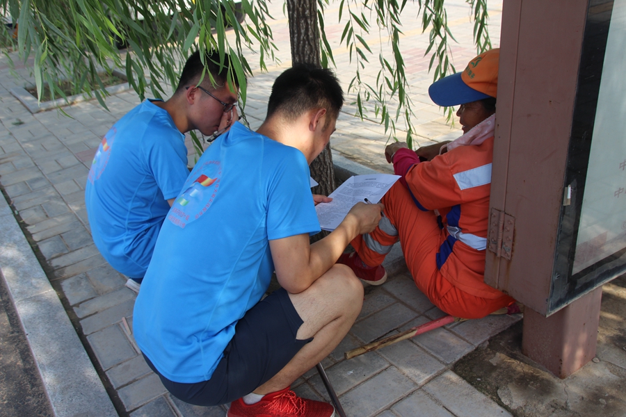 接着队员们在“活地图”克伦老师的带领下,熟悉清水河县的临近街道,并向沿途行人发放主观认同感主题调查问卷,进行社会调查。队员们彬彬有礼,耐心大方的态度也赢得了行人及商户的一致好评。