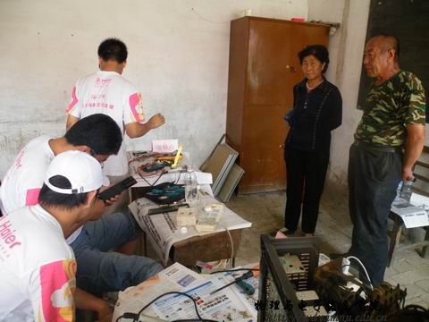 第一站我们来到了讨卜齐村,这里的村民特别热情,短短的一上午时间内我们收到59个大大小小的家电。闲谈时李喜胜大爷对我们说:“我们这里没有家电维修铺,小问题都解决不了,大问题就更不用说了。”当我们问到希望我们的服务再有那些改进时,大爷笑着说:“很好!很好!希望你们常来就好了。”董爱毛大娘拿着修好的电炒锅对我们激动的说:“娃娃们辛苦了!大中午的,要不去家里吃点饭哇!”看着村们真的从我们的服务中得到了实惠,我们心里也乐开了花。