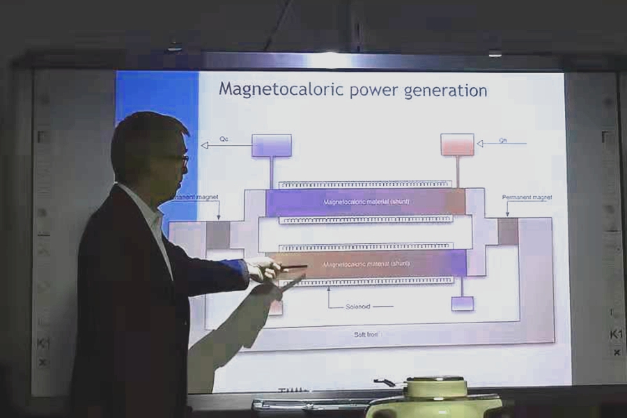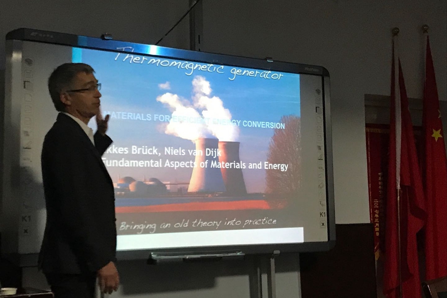 报告会上,Ekkes Bruck教授首先介绍了热磁发电(一种将热能转换为电能的发电装置)的工作原理和应用,在此基础上详细介绍了热磁发电材料的基本特点,并举例Mn-Fe-P-Si-V材料的性能特点。随后,Ekkes Bruck教授介绍了另外一种能量转换技术---热磁电动机(一种将电能转换成机械能的设备)。通过展示热磁电动机的模拟视频,给出了对该新型技术的一种全新的认识。最后,Ekkes Bruck教授与我院师生对两种能量转换技术和热磁材料等问题进行了交流互动,热情解答了师生们提出的问题。