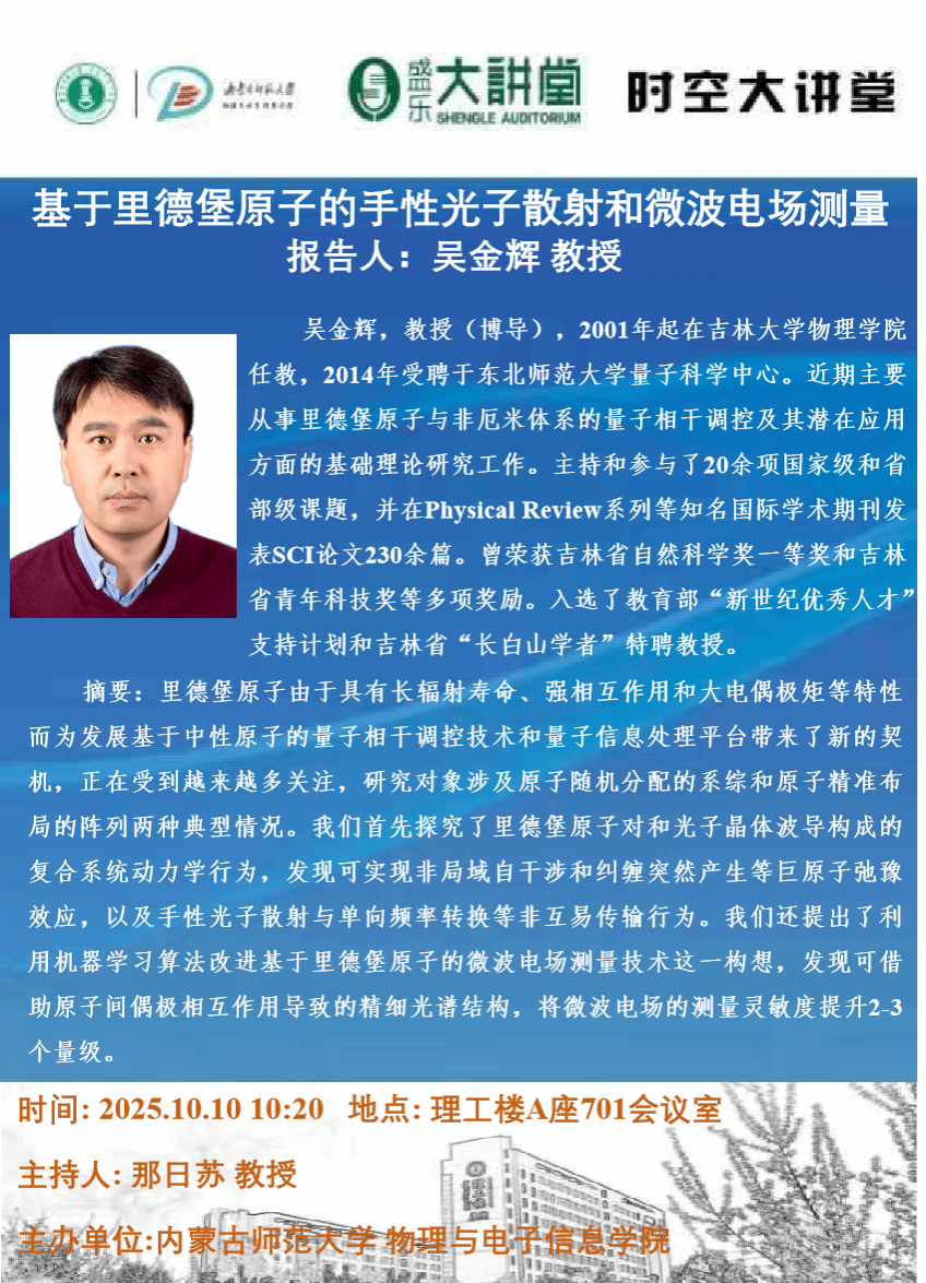 【预告|时空大讲堂】基于里德堡原子的手性光子散射和微波电场测量